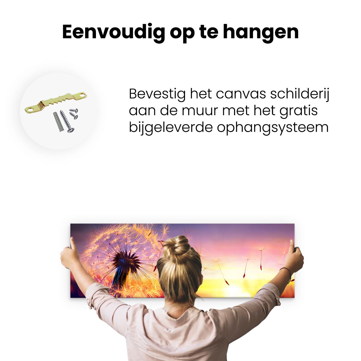 Bij aankoop ontvang je een meegeleverd ophangsysteem, zodat je op een simpele en snelle wijze het schilderij boven de bank of bed kan monteren.