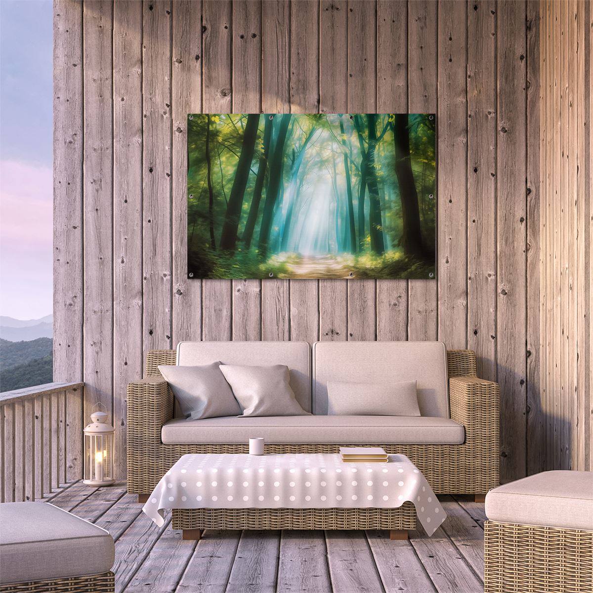 Tuinposter Pad door een Bos met Zonlicht dat door de Bomen Schijnt