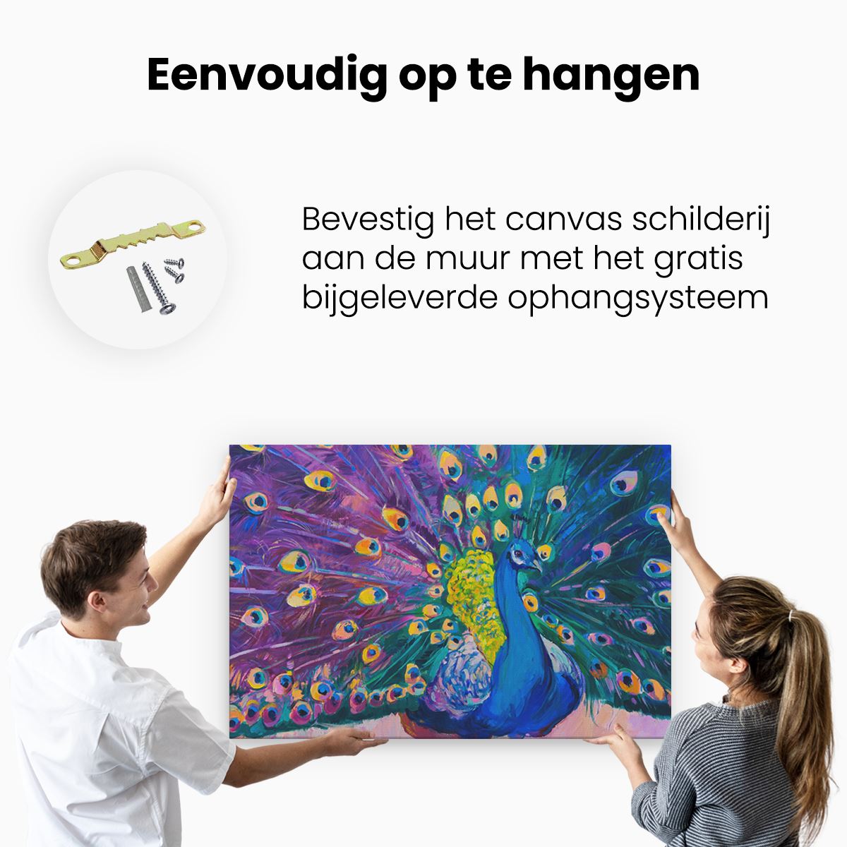 Bij aankoop ontvang je een meegeleverd ophangsysteem, zodat je op een simpele en snelle wijze het schilderij boven de bank of bed kan monteren.