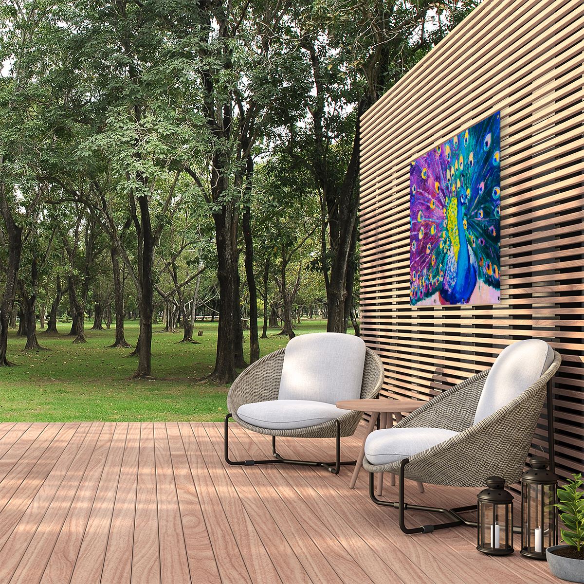 Tuinposter Pauw Met Kleurrijke Veren Van Olieverf - Abstract