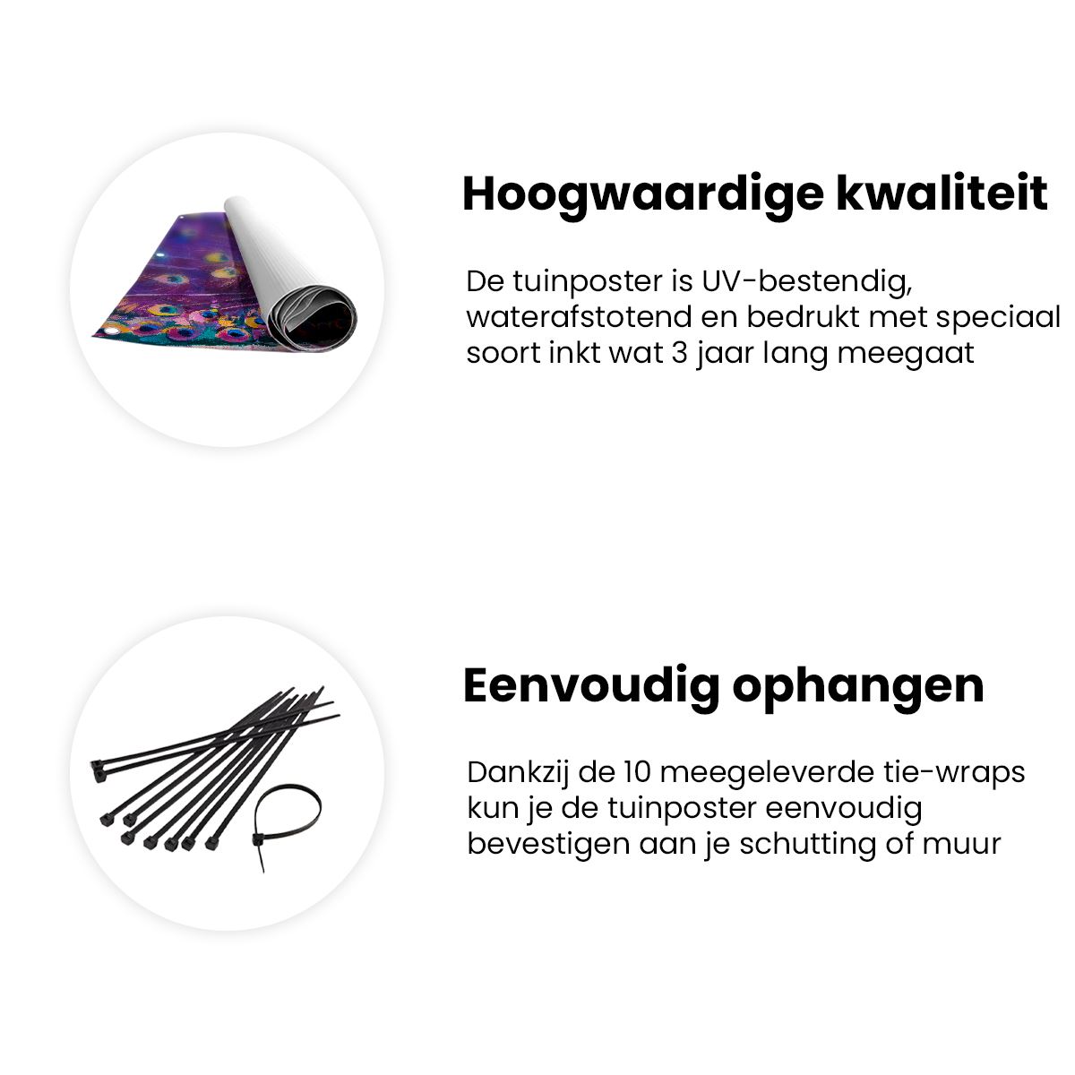 Bij aankoop ontvang je een meegeleverd ophangsysteem, zodat je op een simpele en snelle wijze de tuinposter kan ophangen.