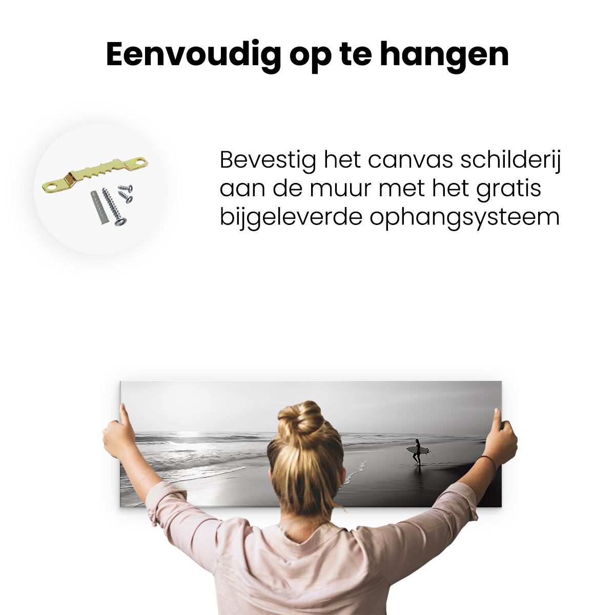 Bij aankoop ontvang je een meegeleverd ophangsysteem, zodat je op een simpele en snelle wijze het schilderij boven de bank of bed kan monteren.