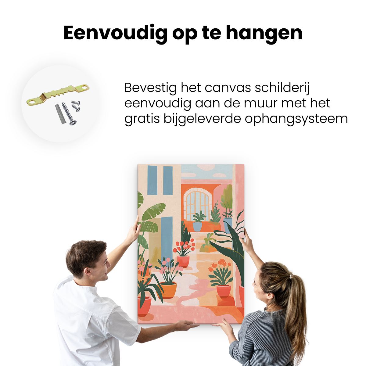 Bij aankoop ontvang je een meegeleverd ophangsysteem, zodat je op een simpele en snelle wijze het schilderij boven de bank of bed kan monteren.