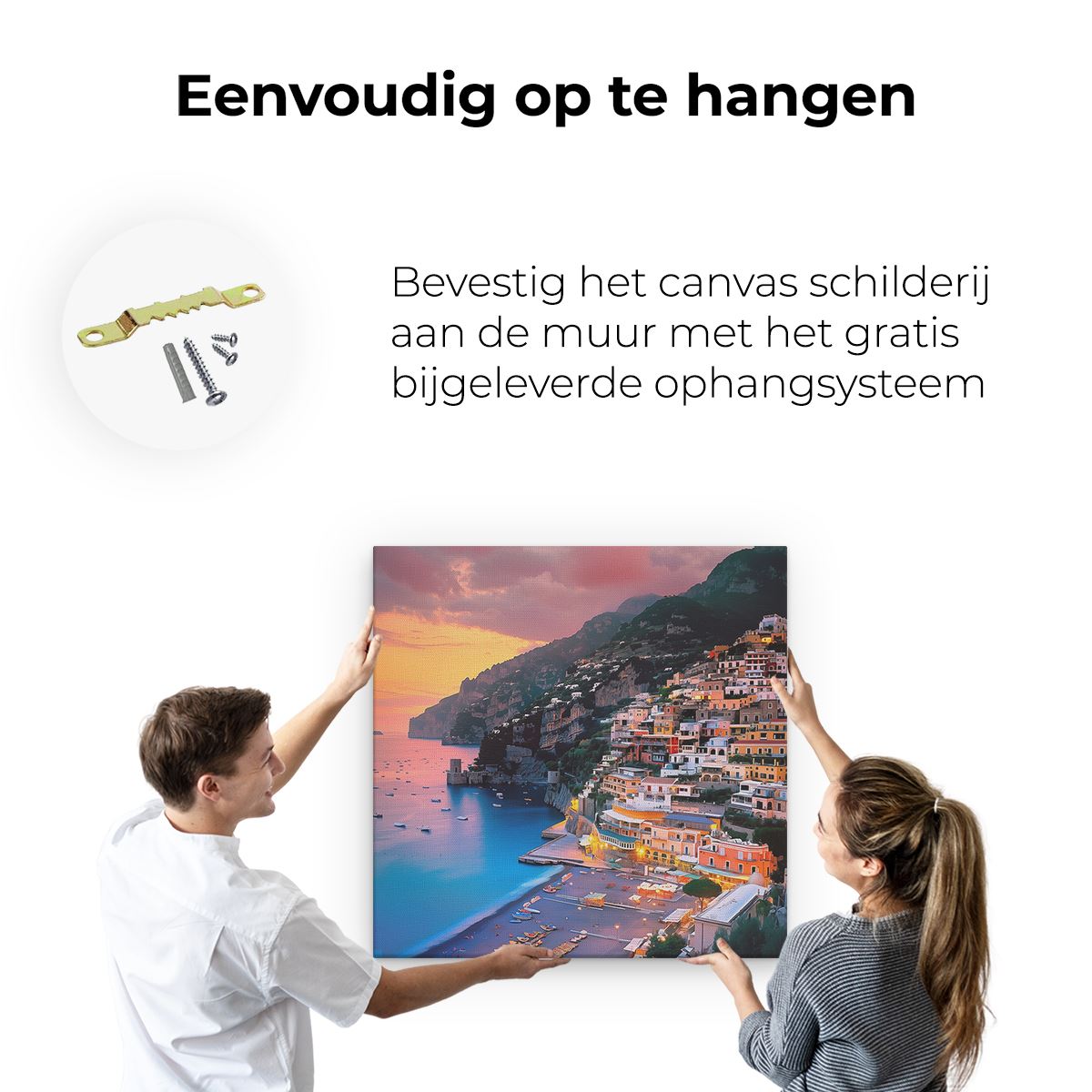 Bij aankoop ontvang je een meegeleverd ophangsysteem, zodat je op een simpele en snelle wijze het schilderij boven de bank of bed kan monteren.