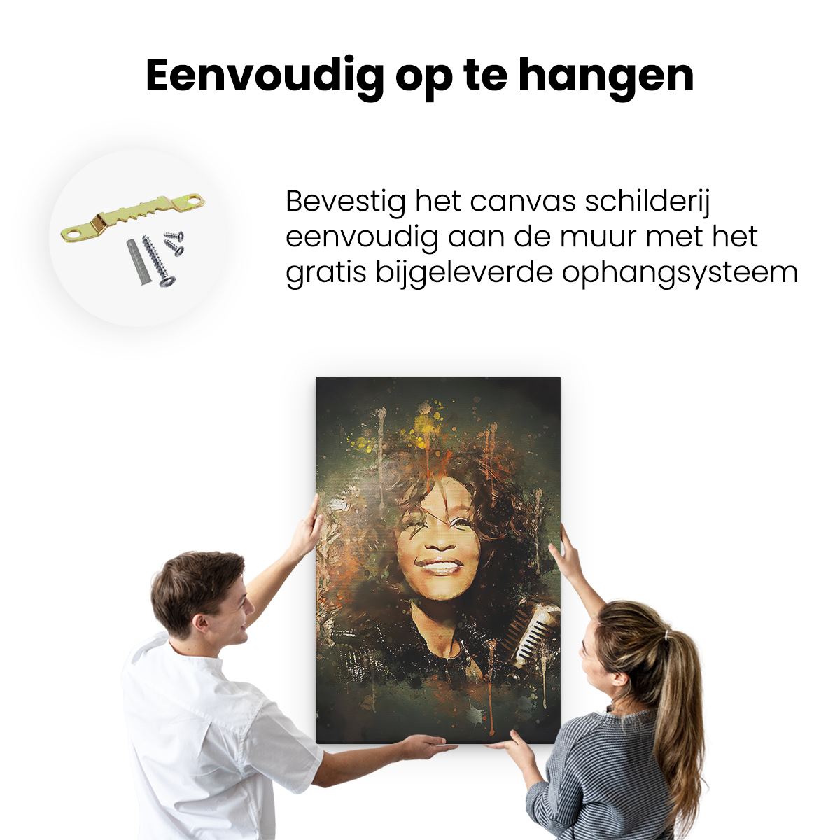 Bij aankoop ontvang je een meegeleverd ophangsysteem, zodat je op een simpele en snelle wijze het schilderij boven de bank of bed kan monteren.