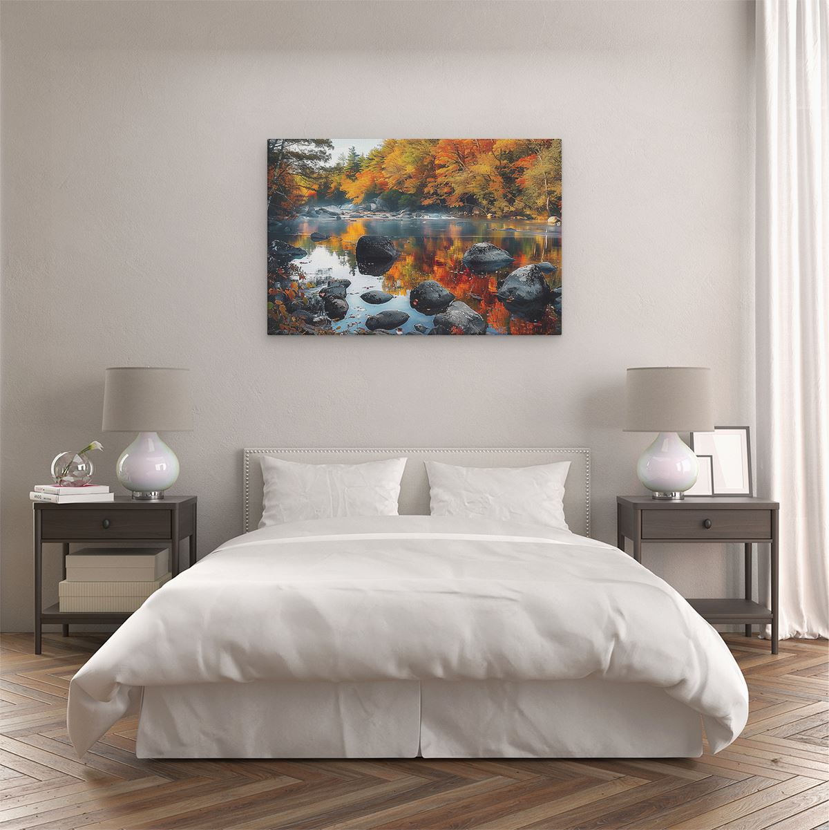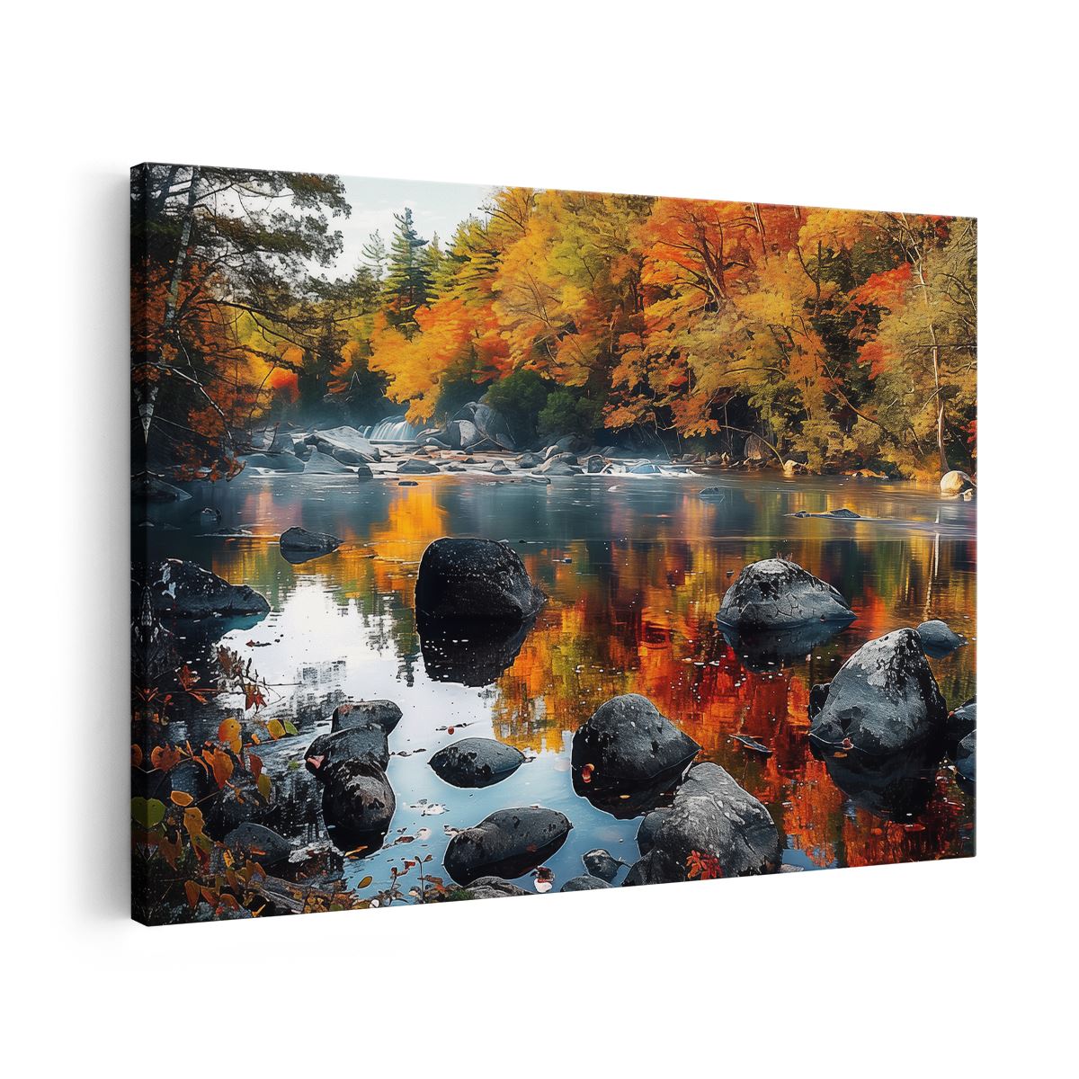 Schilderij Rivier Omringd door Bomen en Rotsen
