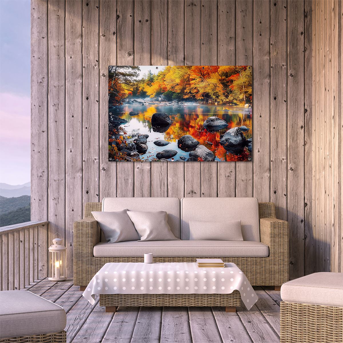 Tuinposter Rivier Omringd door Bomen en Rotsen