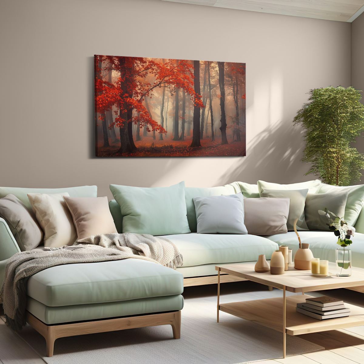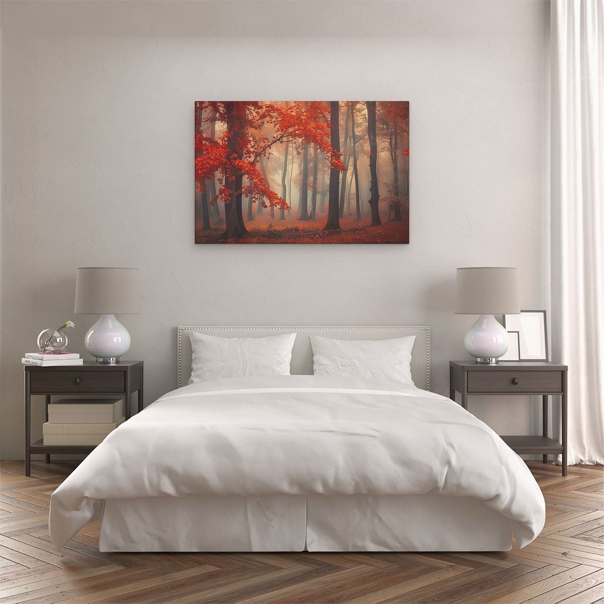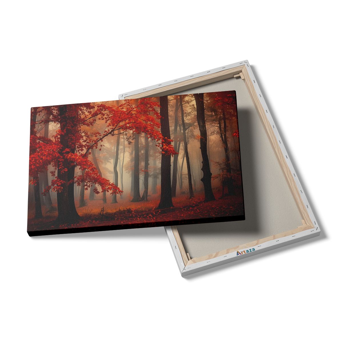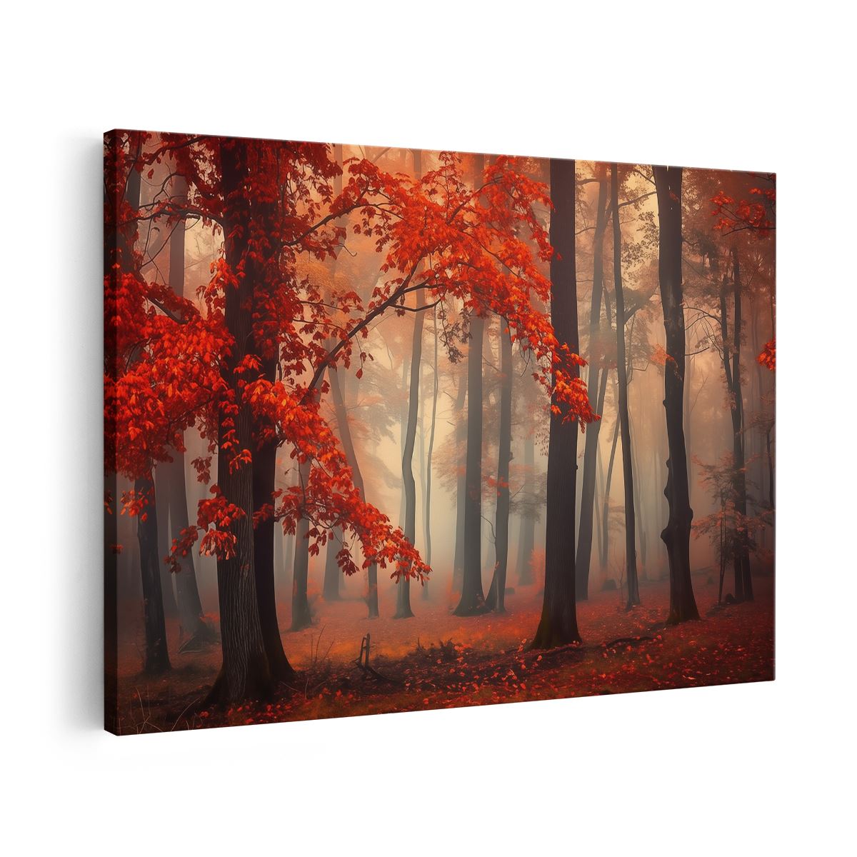 Schilderij Rode Bladeren in een Mistig Bos