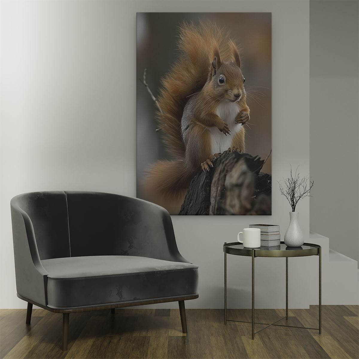 Schilderij Rode Eekhoorn Zittend op een Boomstronk