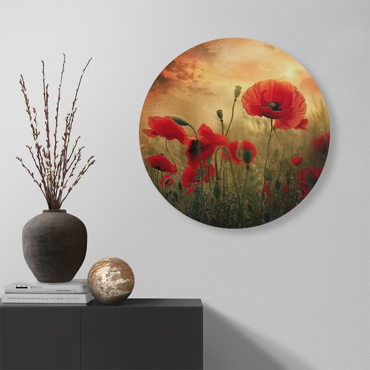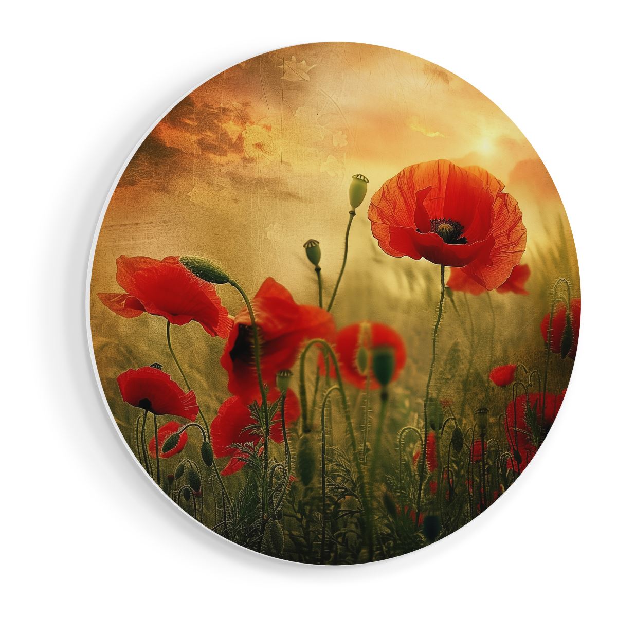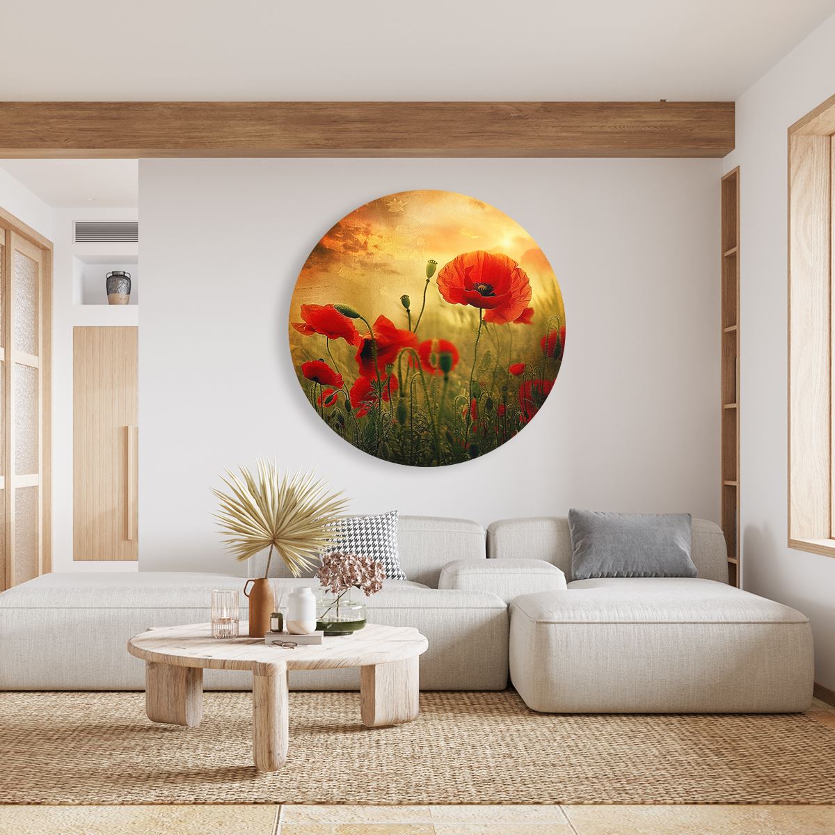 Wandcirkel Rode Papavers in een Veld bij Zonsondergang