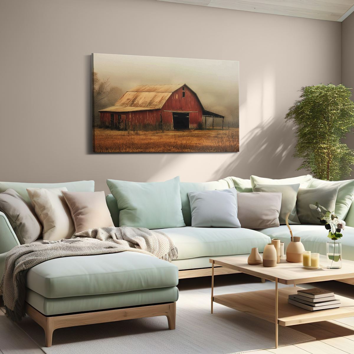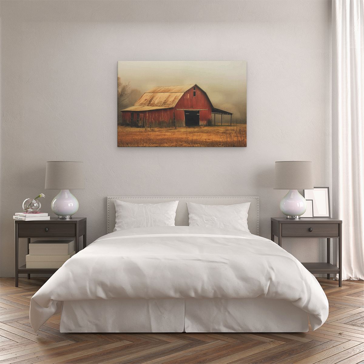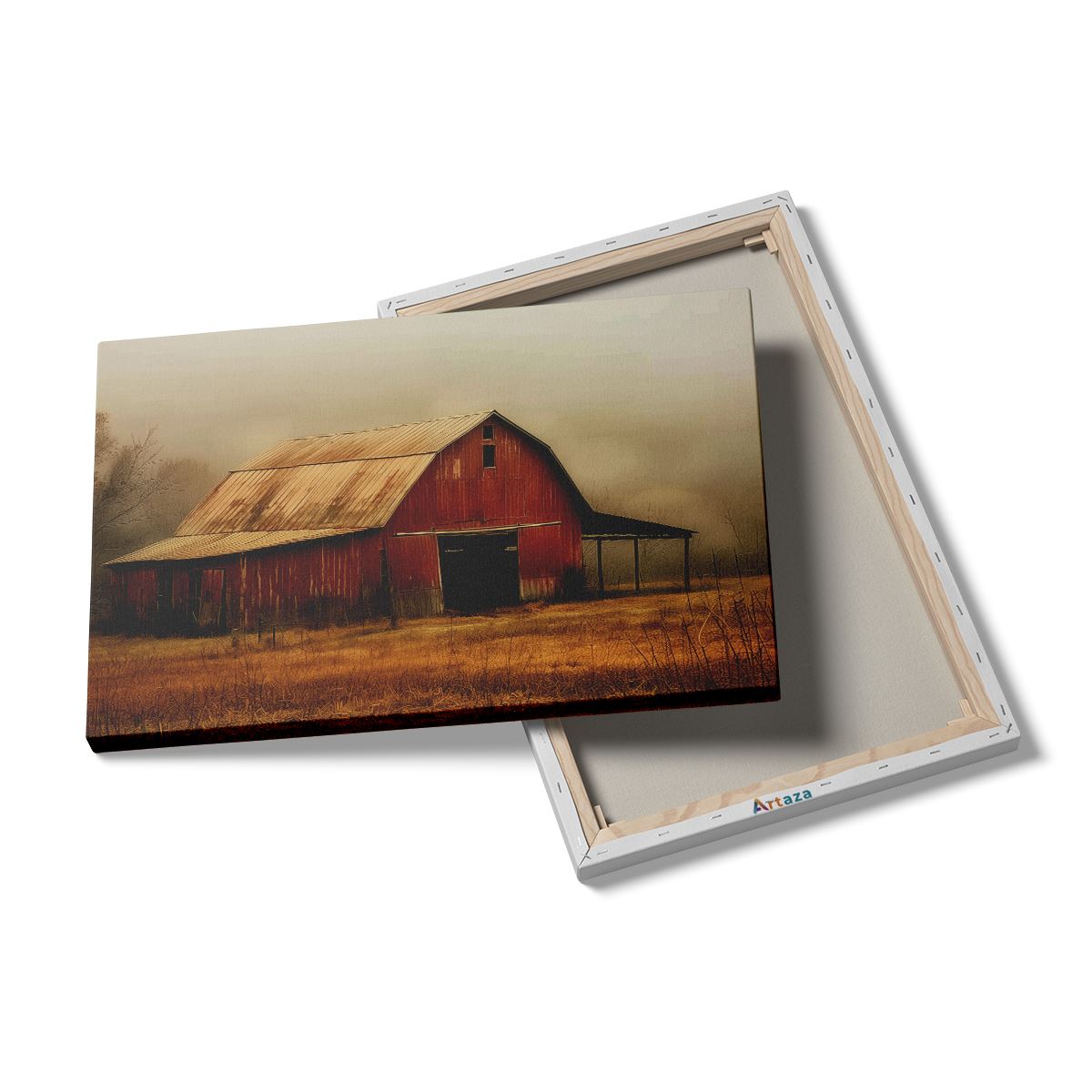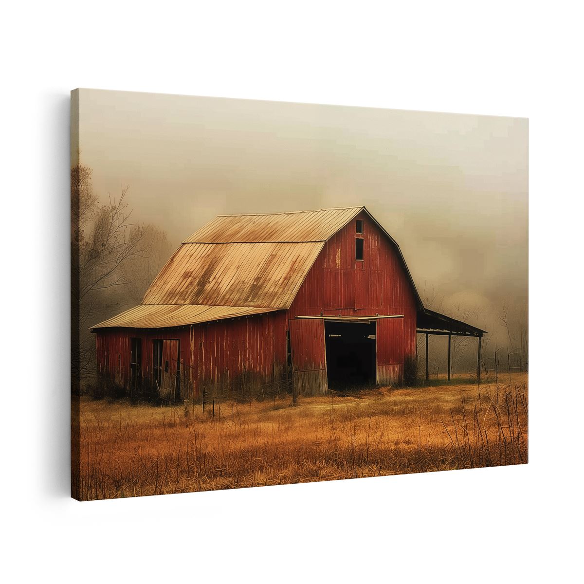 Schilderij Rode Schuur in een Mistig Veld