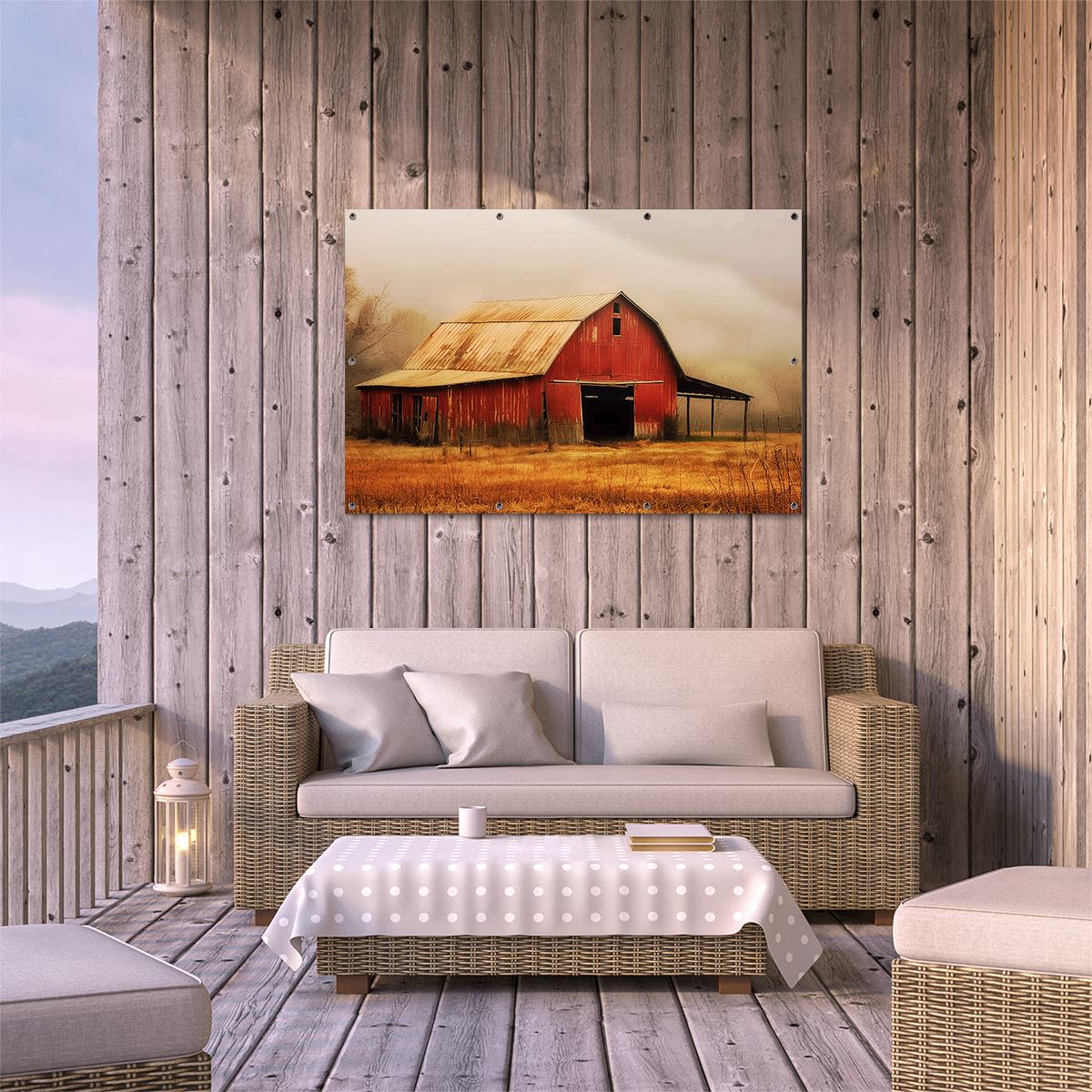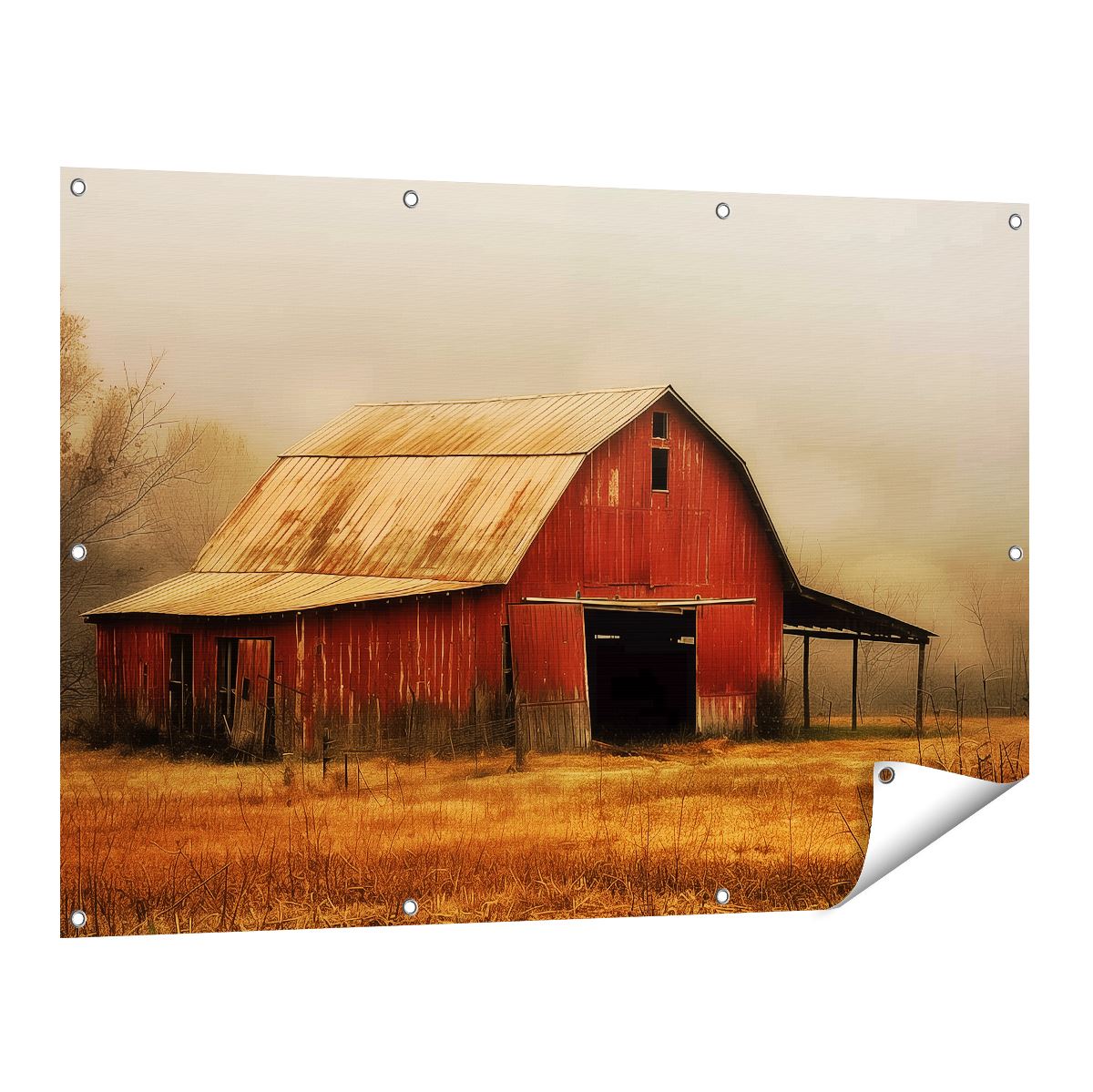 Tuinposter Rode Schuur in een Mistig Veld
