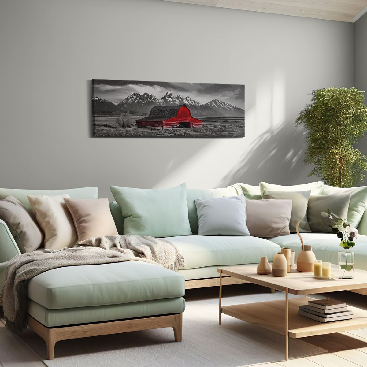 Schilderij Rode Schuur met Bergen op de Achtergrond