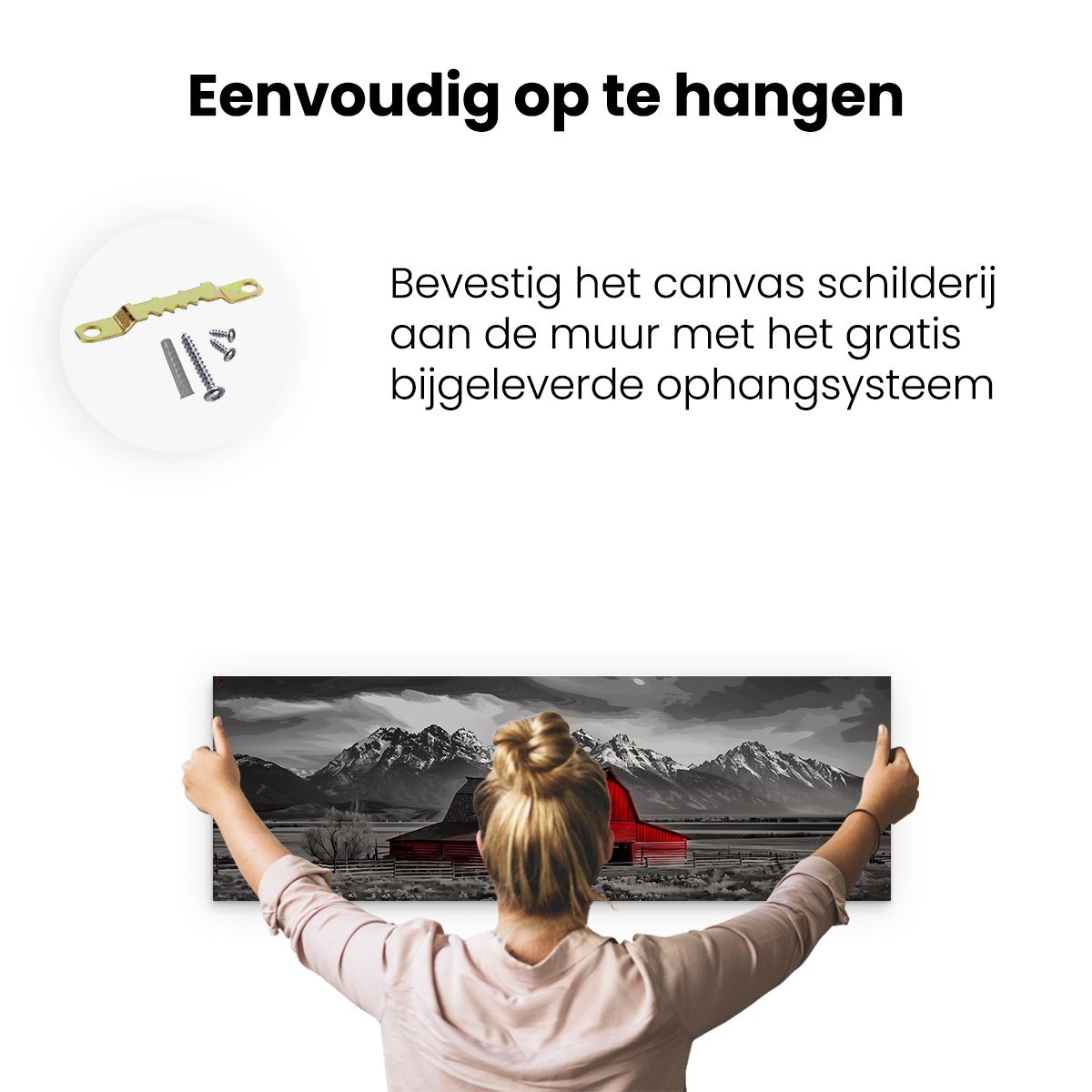 Bij aankoop ontvang je een meegeleverd ophangsysteem, zodat je op een simpele en snelle wijze het schilderij boven de bank of bed kan monteren.
