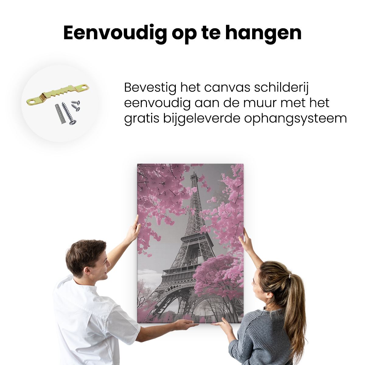 Bij aankoop ontvang je een meegeleverd ophangsysteem, zodat je op een simpele en snelle wijze het schilderij boven de bank of bed kan monteren.