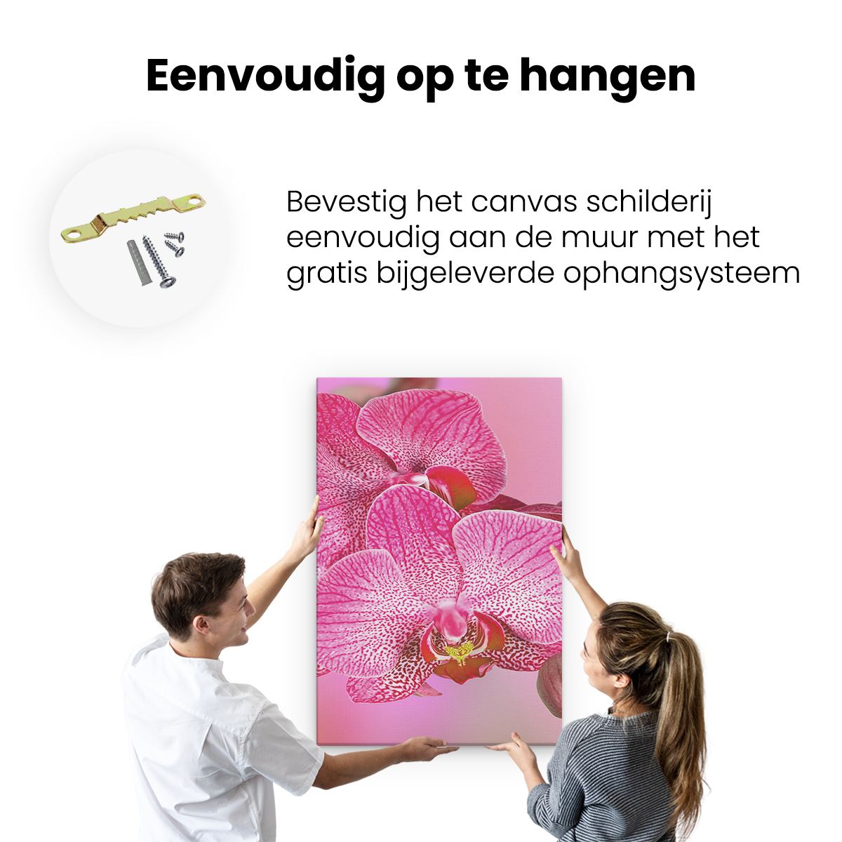 Bij aankoop ontvang je een meegeleverd ophangsysteem, zodat je op een simpele en snelle wijze het schilderij boven de bank of bed kan monteren.
