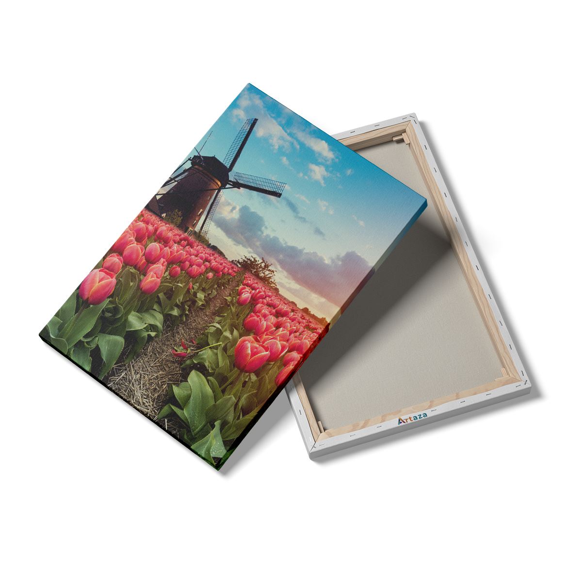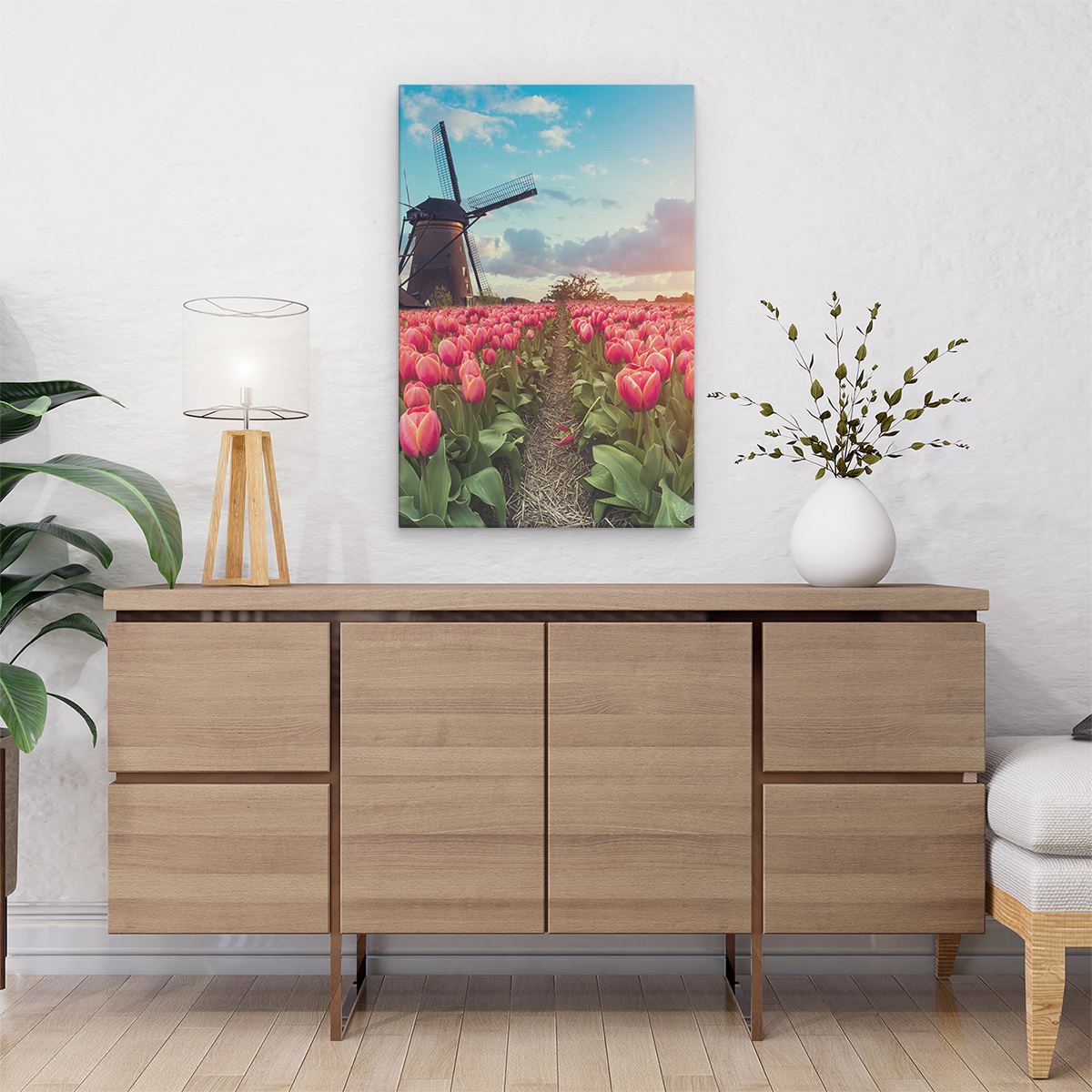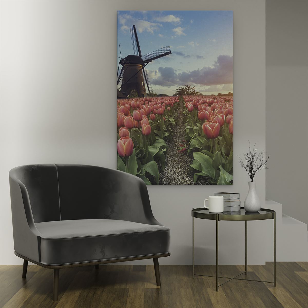 Schilderij Roze Tulpen Bloemenveld - Met Windmolen