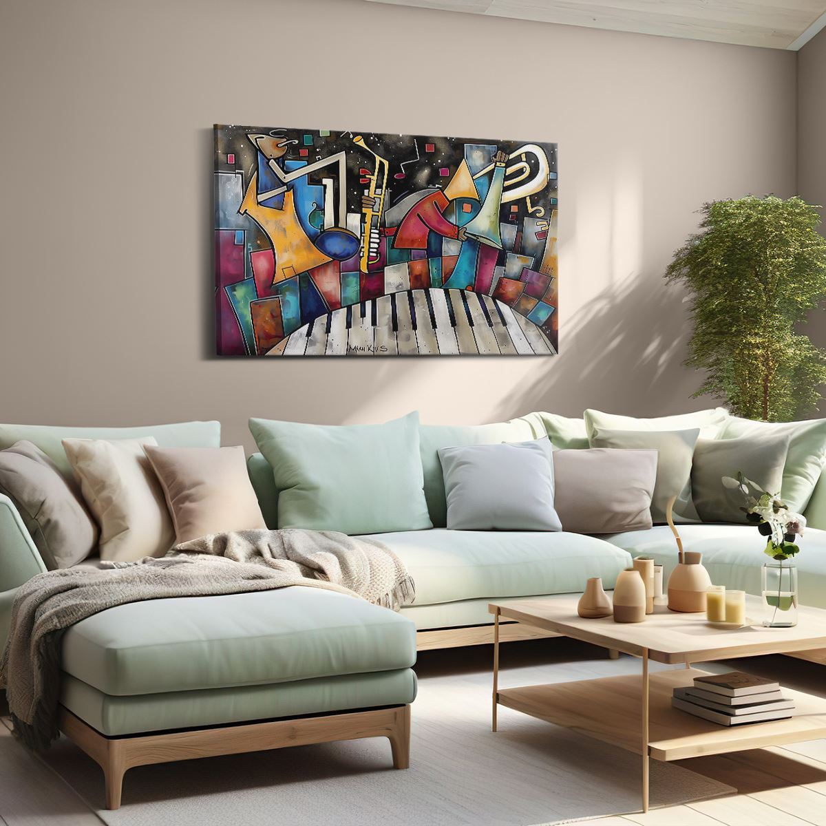 Schilderij Saxofoon, Piano en Saxofoon