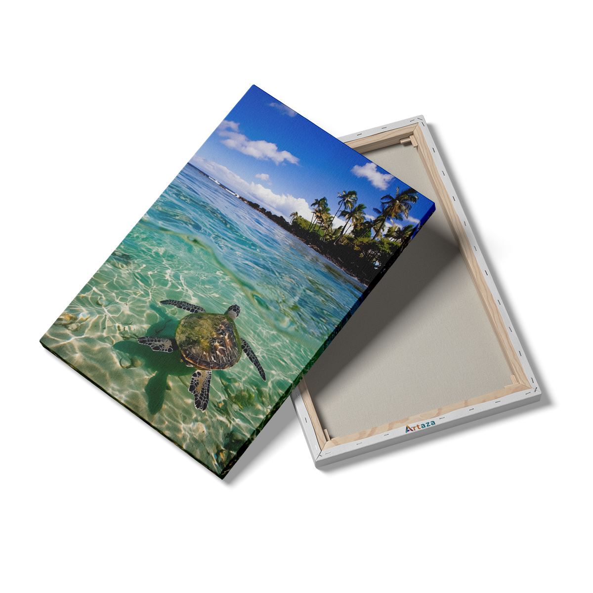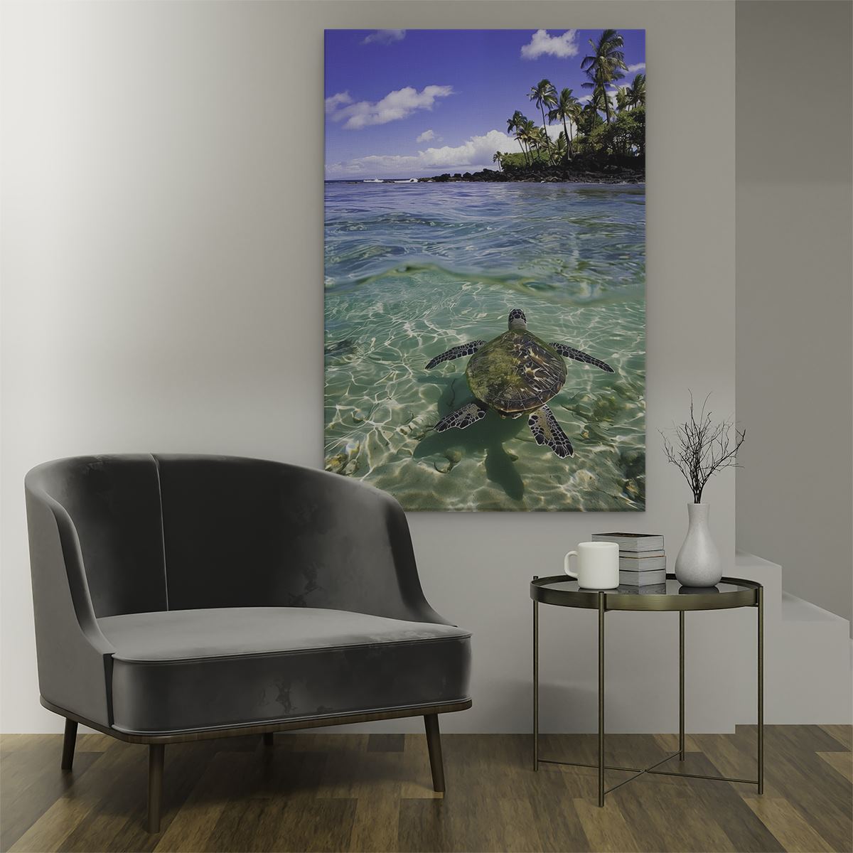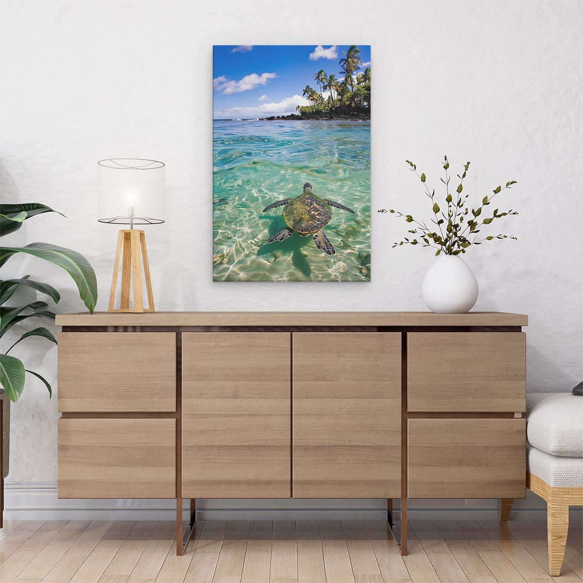 Schilderij Schildpad Zwemmen in Helder Water in de Buurt van Palmbomen