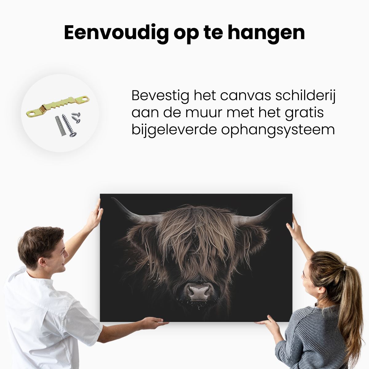 Bij aankoop ontvang je een meegeleverd ophangsysteem, zodat je op een simpele en snelle wijze het schilderij boven de bank of bed kan monteren.