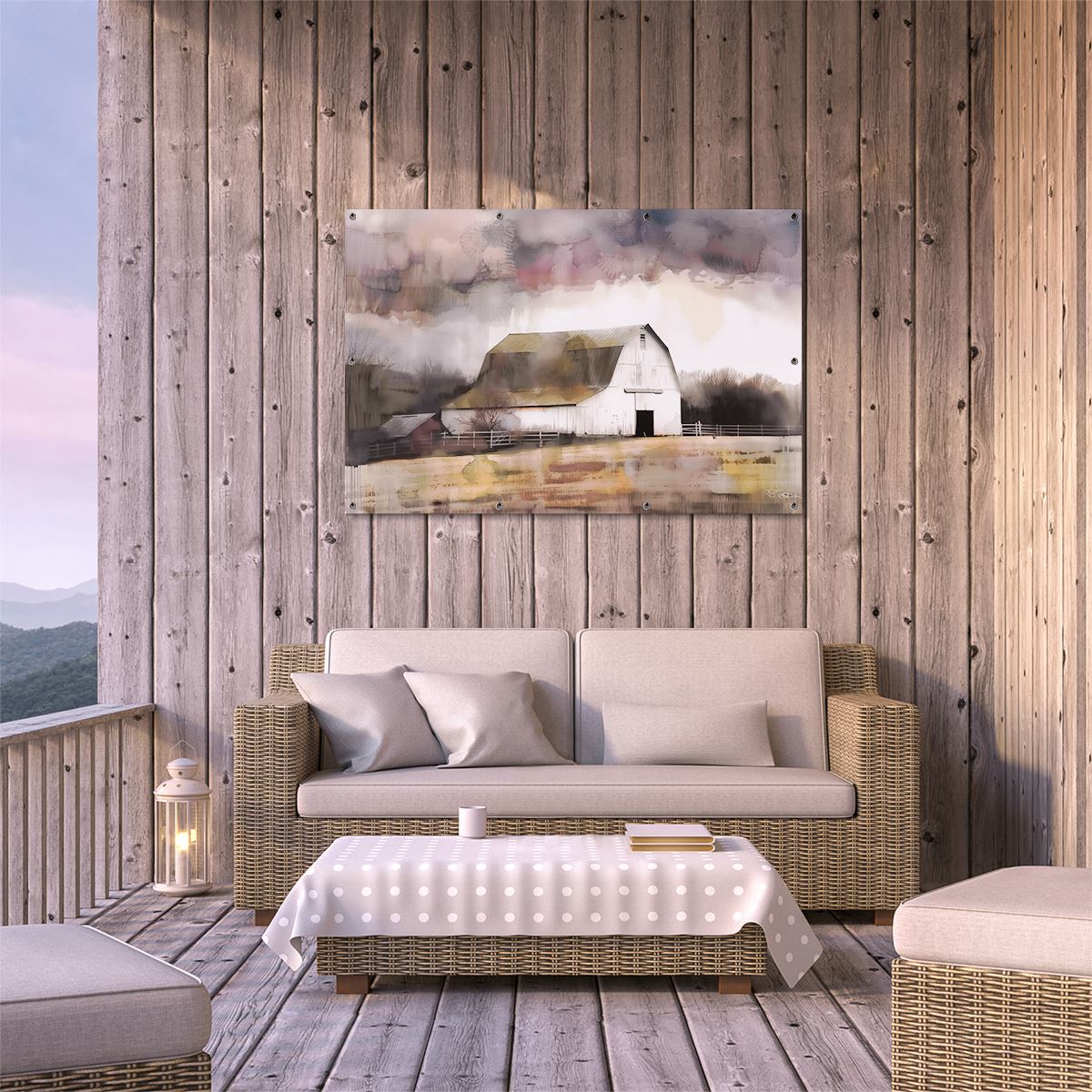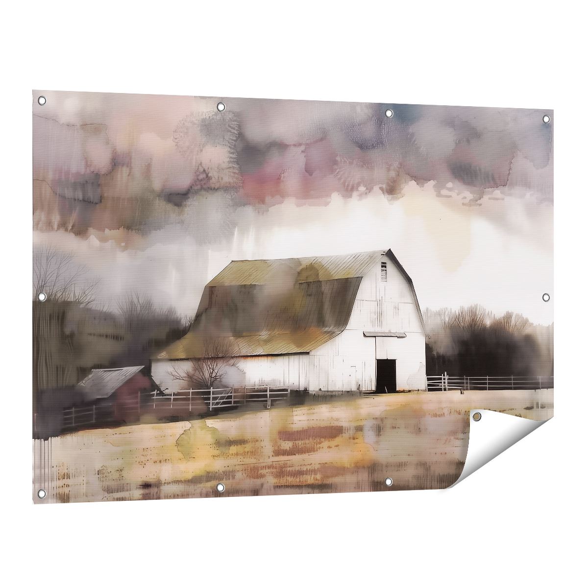Tuinposter Schuur in een Veld met een Stormachtige Lucht