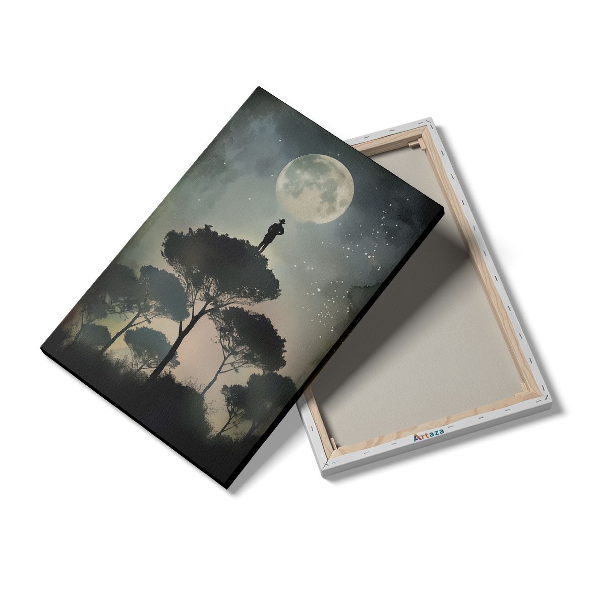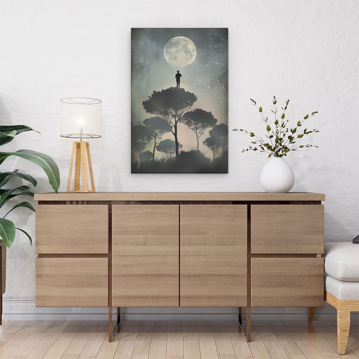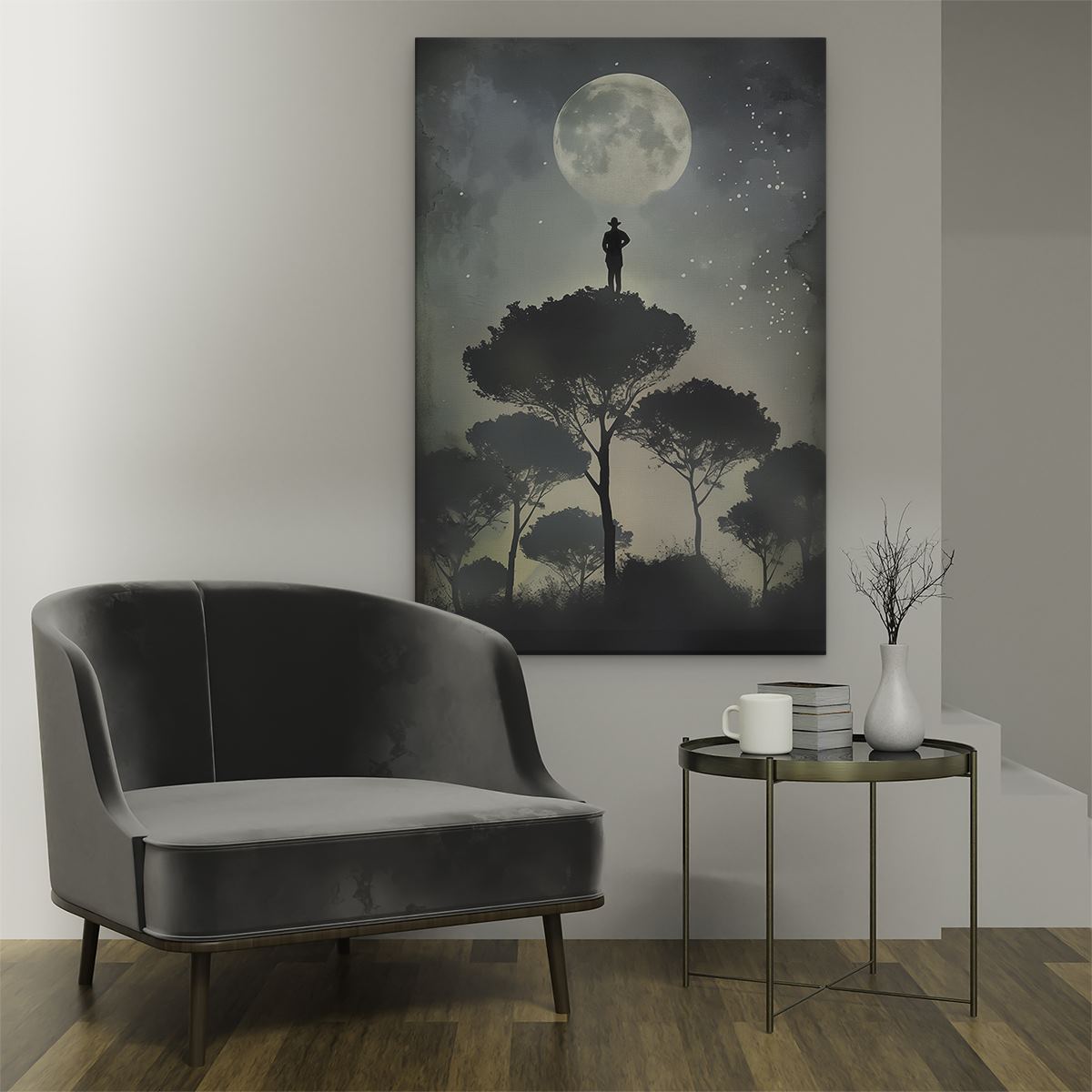 Schilderij Silhouet van een Man die Bovenop een Boom Staat met een Volle Maan op de Achtergrond