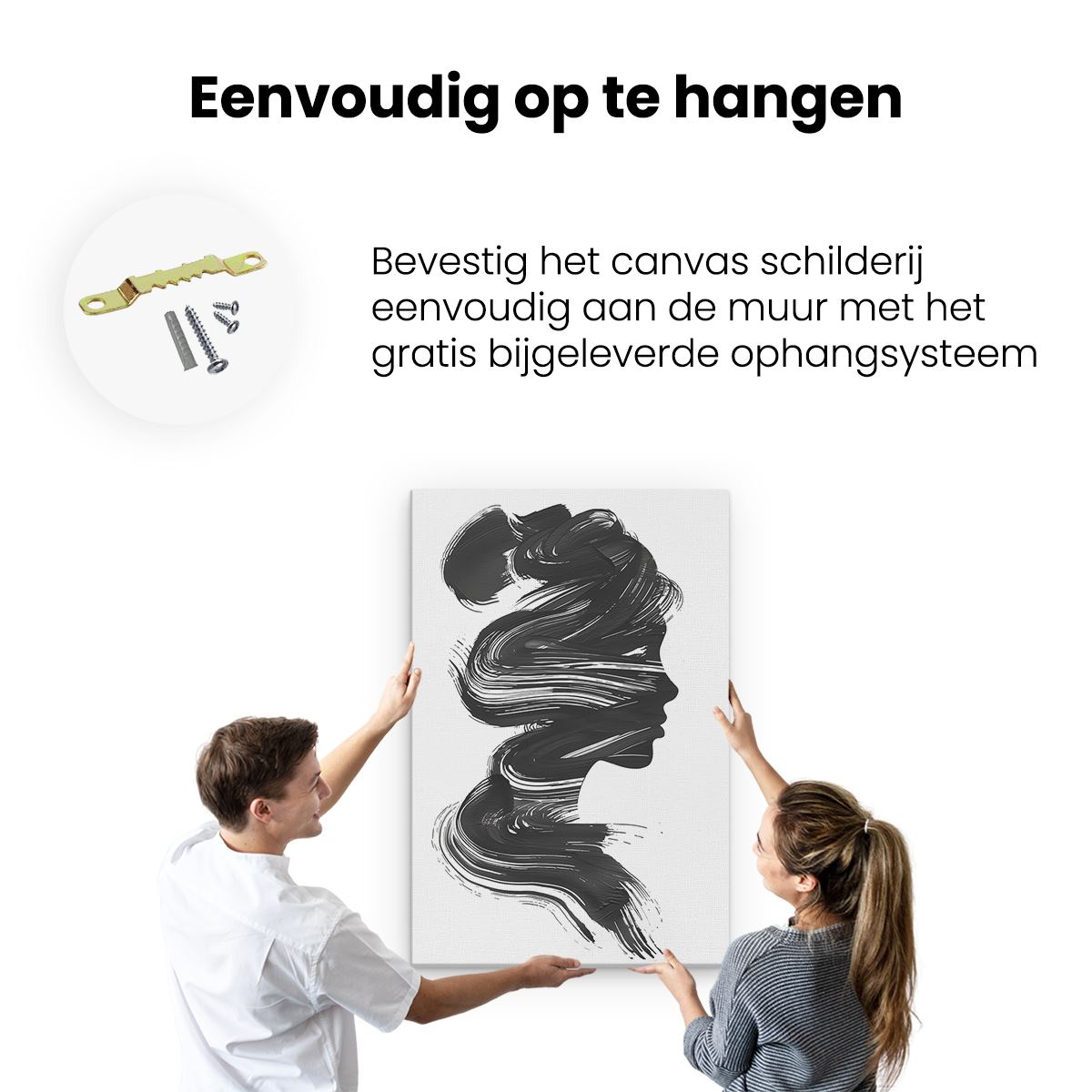 Bij aankoop ontvang je een meegeleverd ophangsysteem, zodat je op een simpele en snelle wijze het schilderij boven de bank of bed kan monteren.