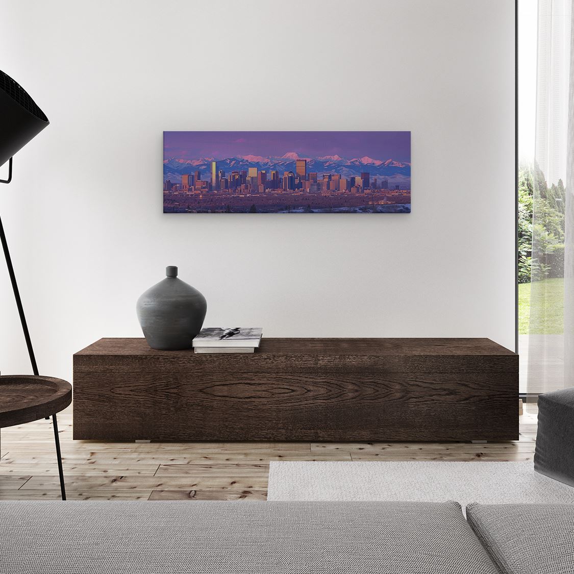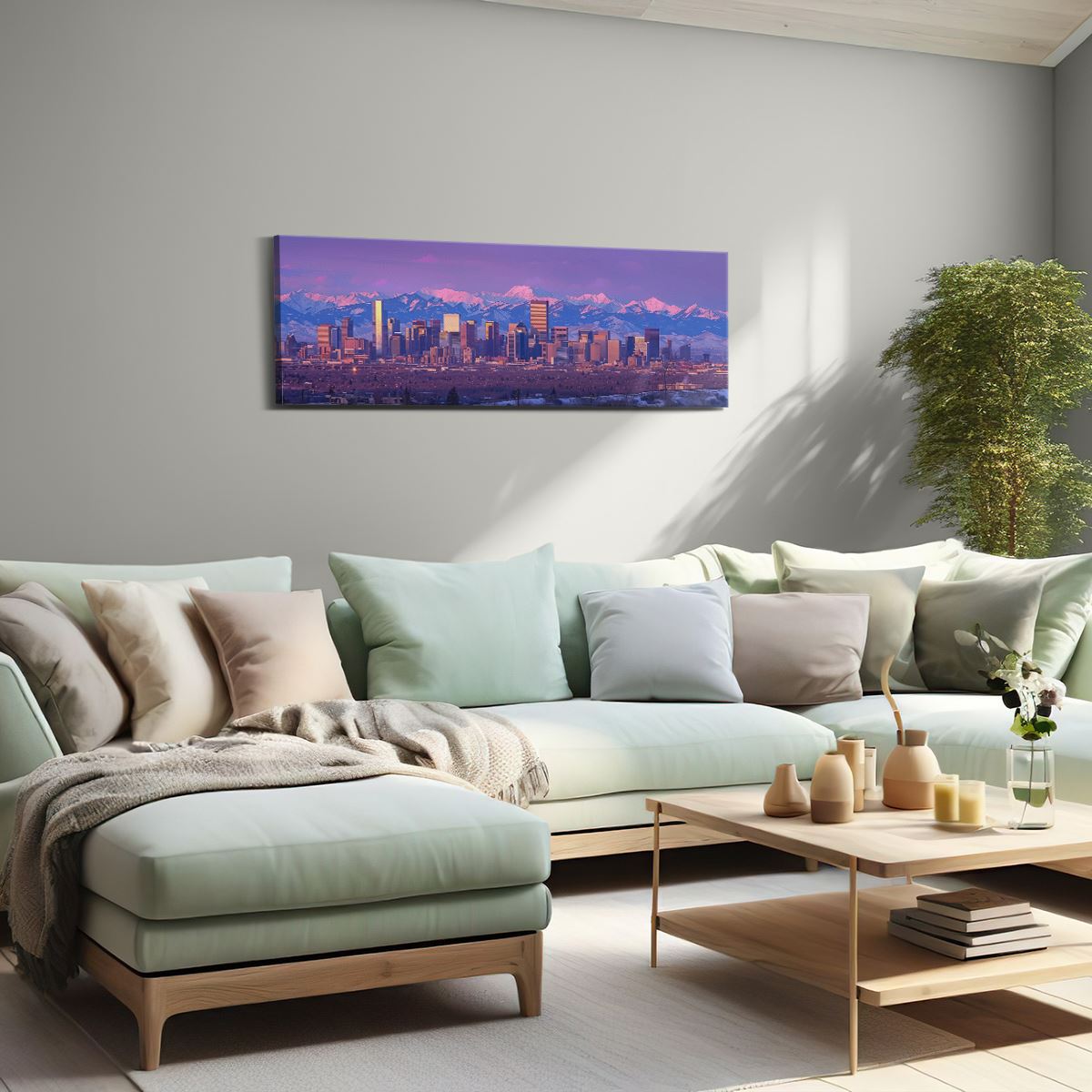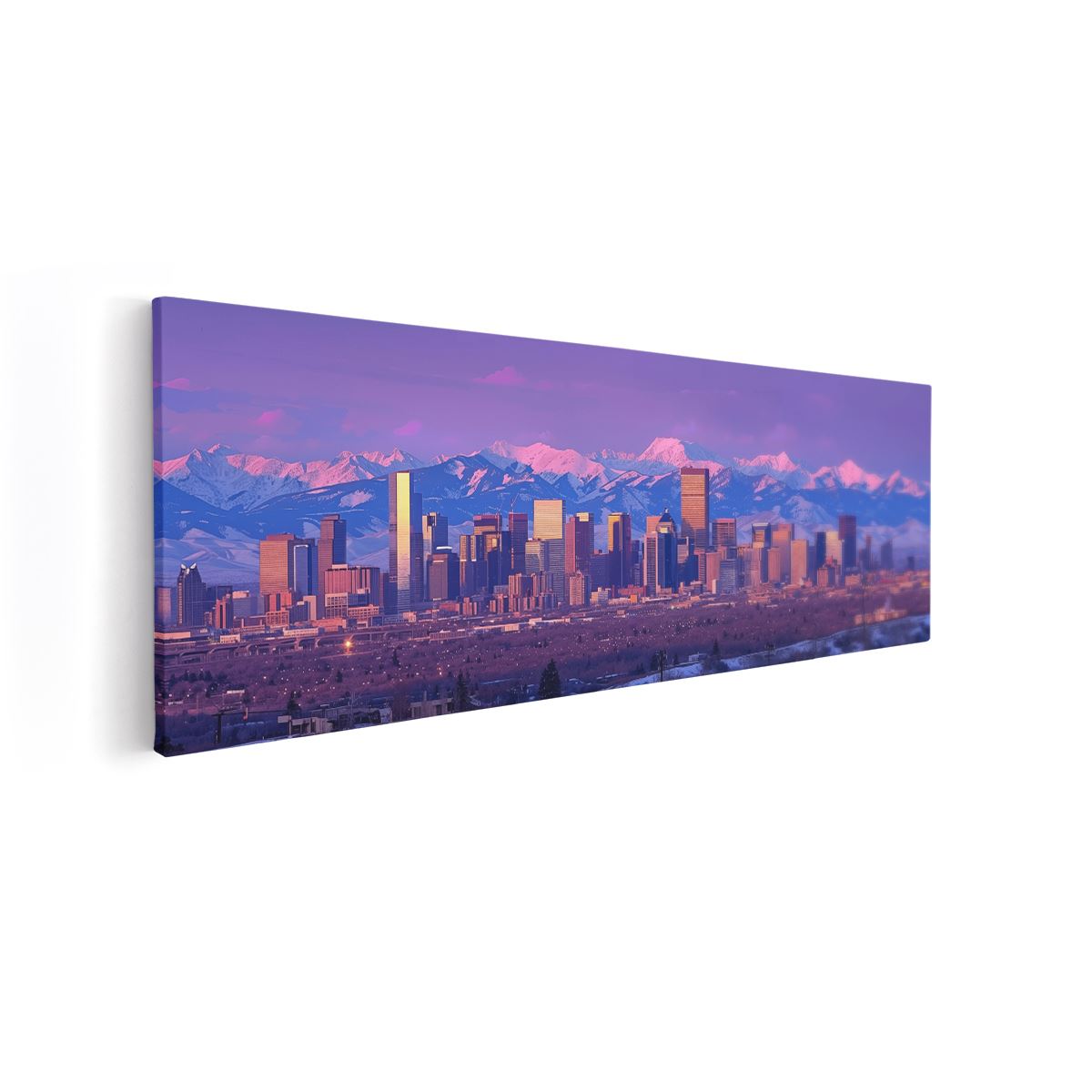 Schilderij Skyline van de Stad met Besneeuwde Bergen op de Achtergrond