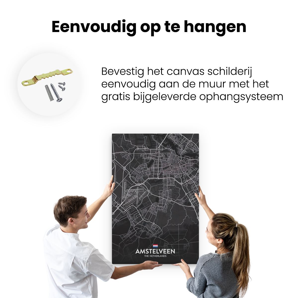 Bij aankoop ontvang je een meegeleverd ophangsysteem, zodat je op een simpele en snelle wijze het schilderij boven de bank of bed kan monteren.