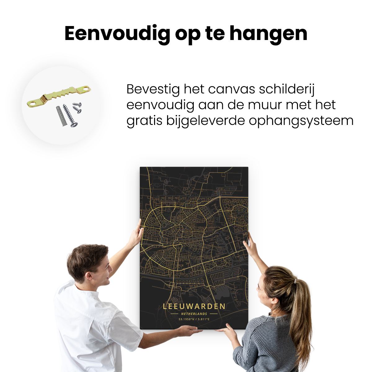 Bij aankoop ontvang je een meegeleverd ophangsysteem, zodat je op een simpele en snelle wijze het schilderij boven de bank of bed kan monteren.