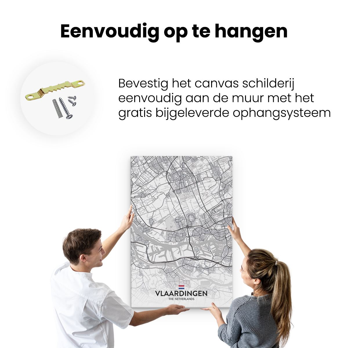 Bij aankoop ontvang je een meegeleverd ophangsysteem, zodat je op een simpele en snelle wijze het schilderij boven de bank of bed kan monteren.