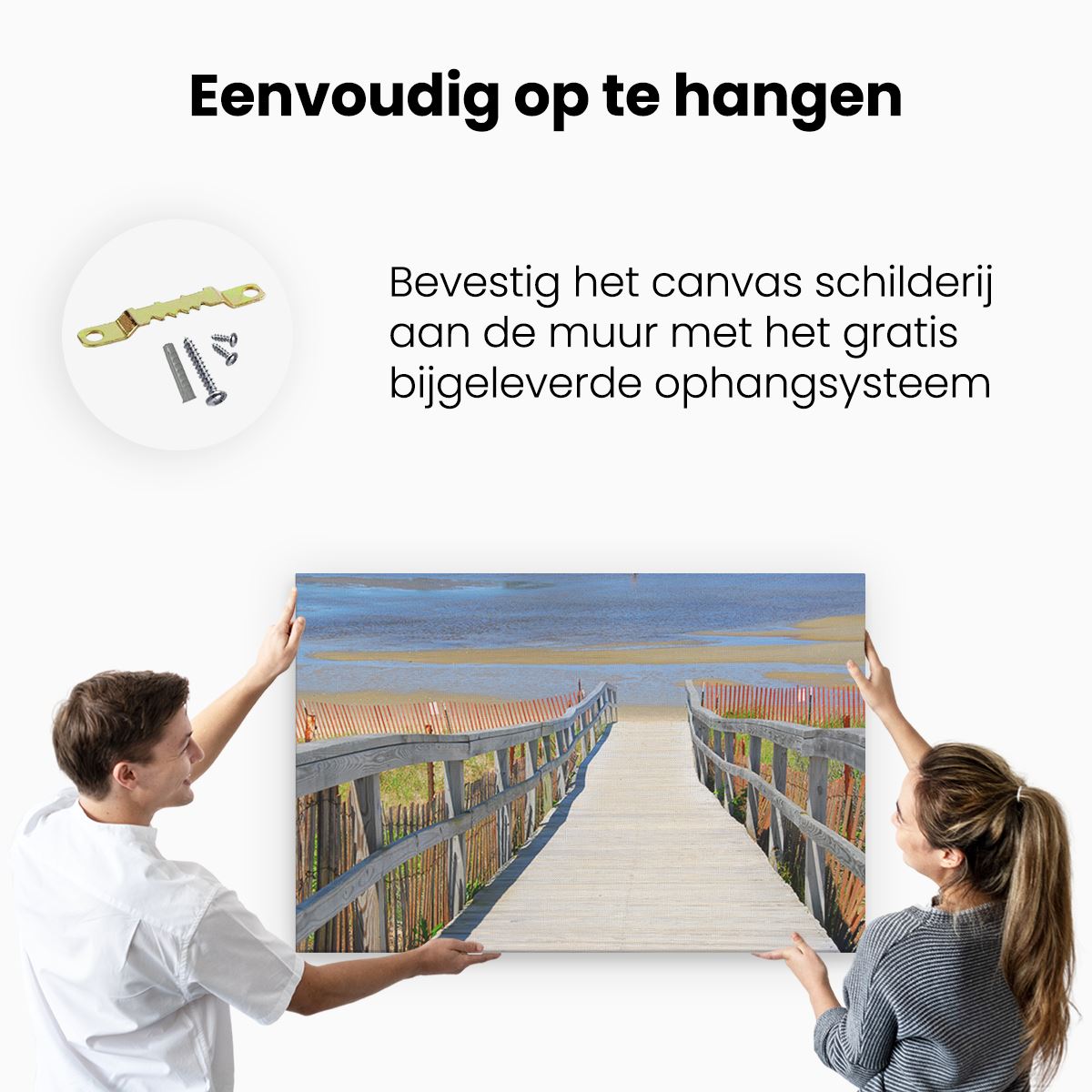 Bij aankoop ontvang je een meegeleverd ophangsysteem, zodat je op een simpele en snelle wijze het schilderij boven de bank of bed kan monteren.