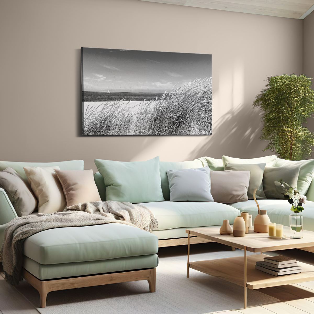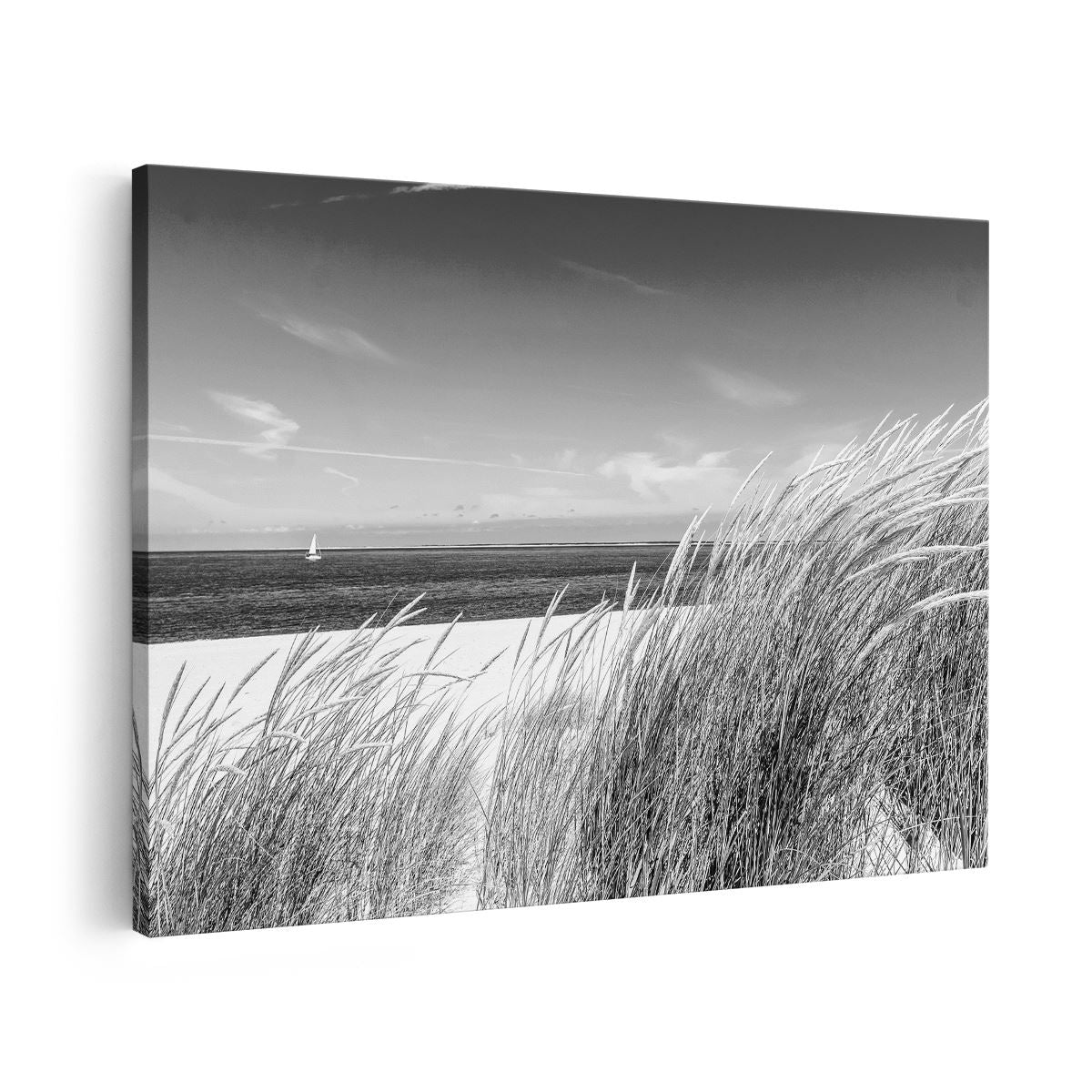 Schilderij Strand en Zee met een Zeilboot - Zwart Wit
