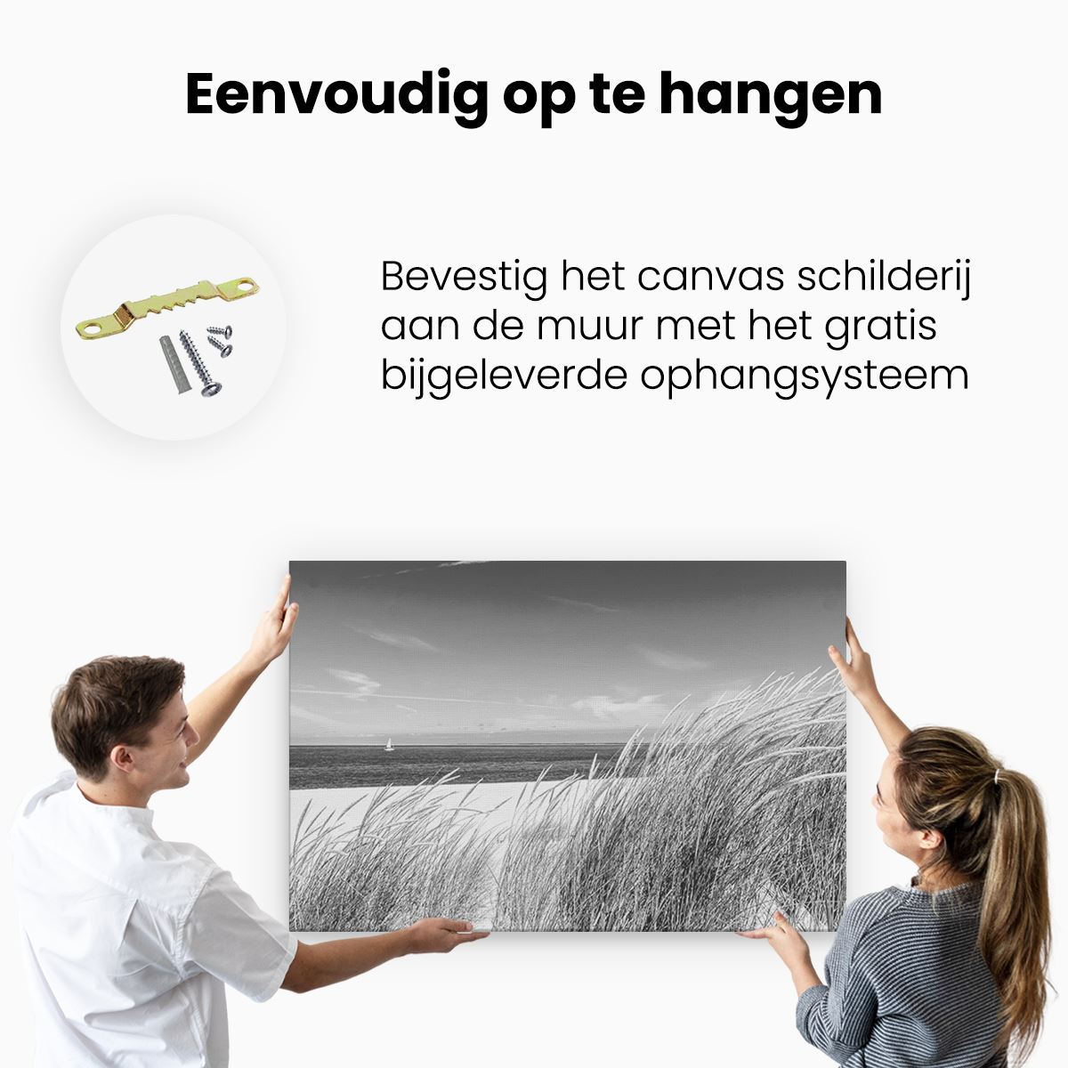 Bij aankoop ontvang je een meegeleverd ophangsysteem, zodat je op een simpele en snelle wijze het schilderij boven de bank of bed kan monteren.