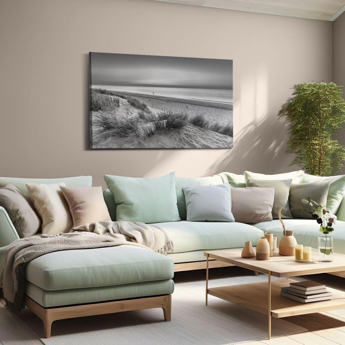 Schilderij Strand en Zee vanuit de Duinen - Zwart Wit