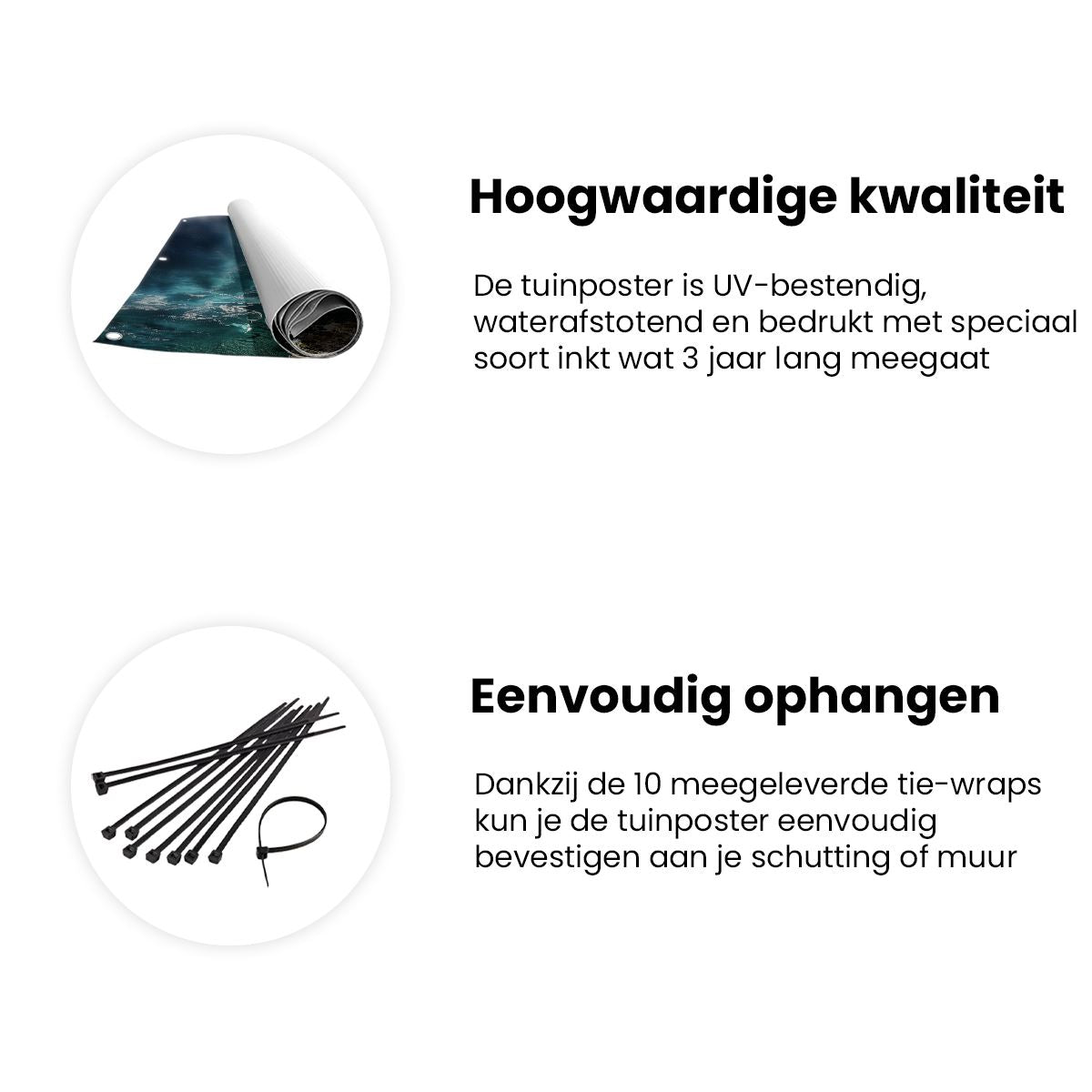 Bij aankoop ontvang je een meegeleverd ophangsysteem, zodat je op een simpele en snelle wijze de tuinposter kan ophangen.