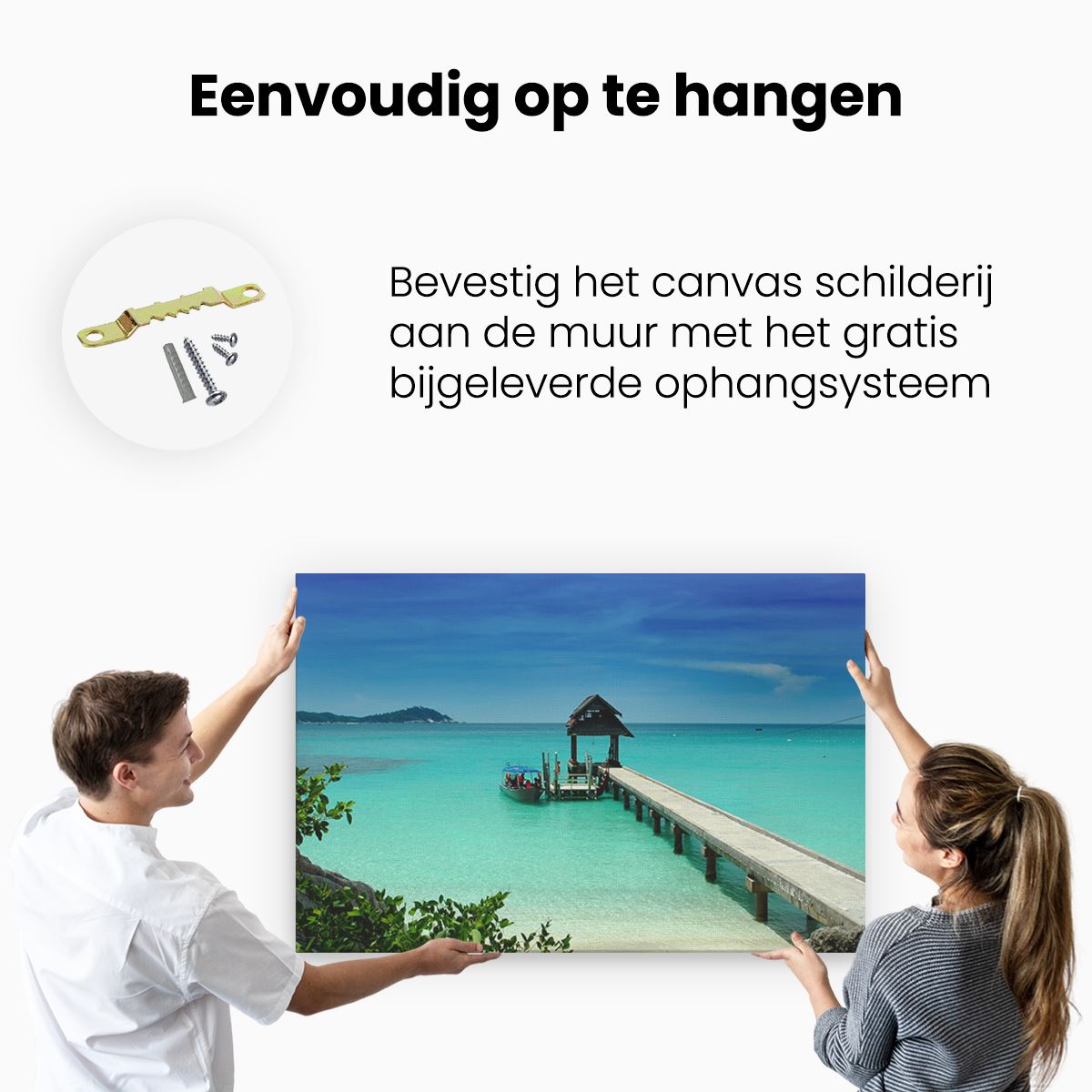 Bij aankoop ontvang je een meegeleverd ophangsysteem, zodat je op een simpele en snelle wijze het schilderij boven de bank of bed kan monteren.