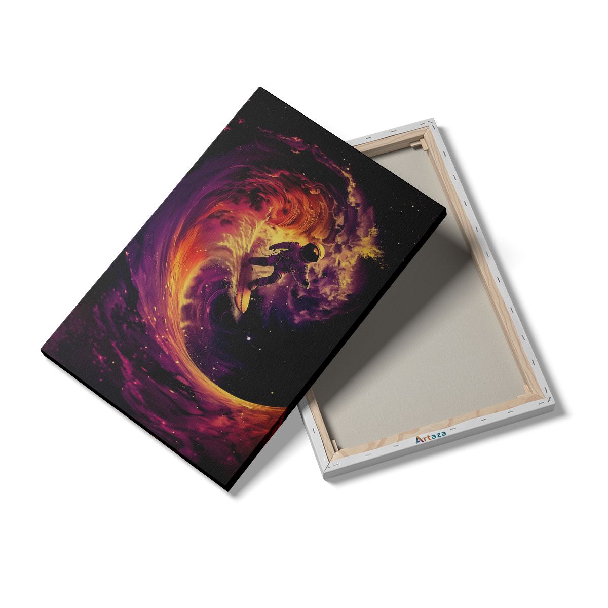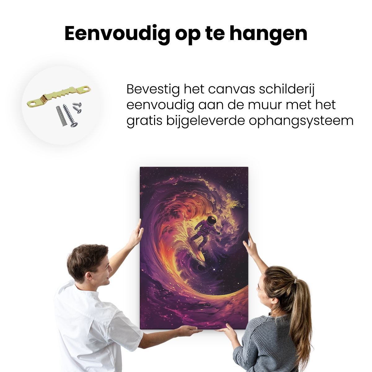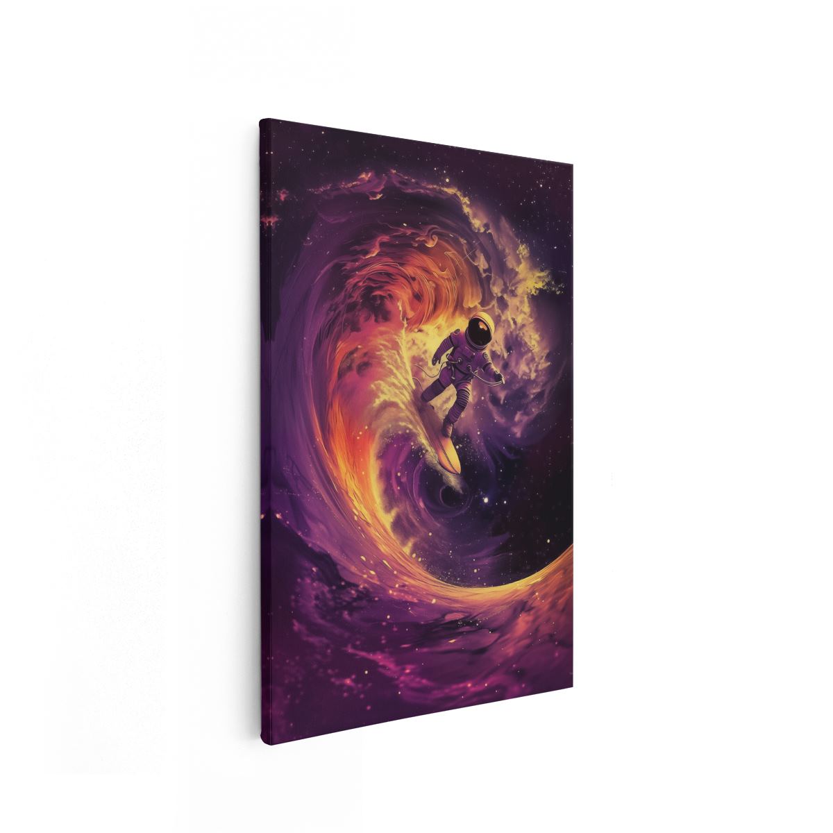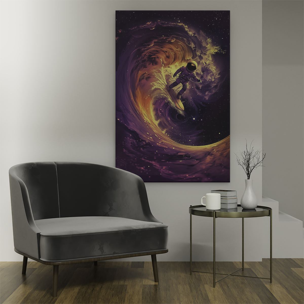 Schilderij Surfer die op een Golf in de Ruimte Rijdt