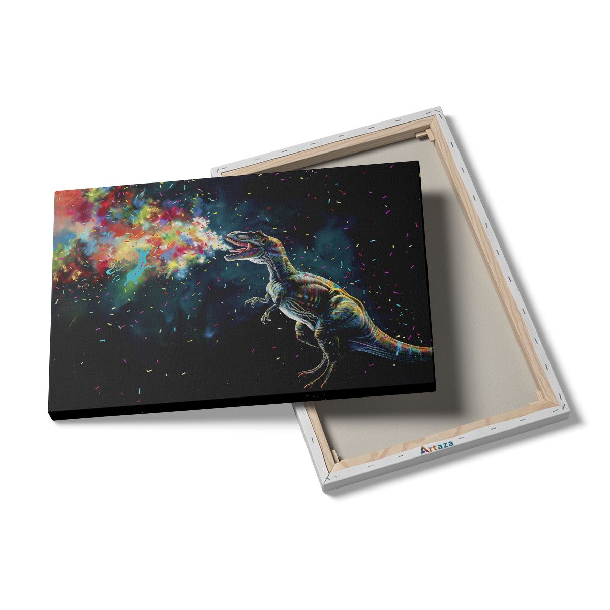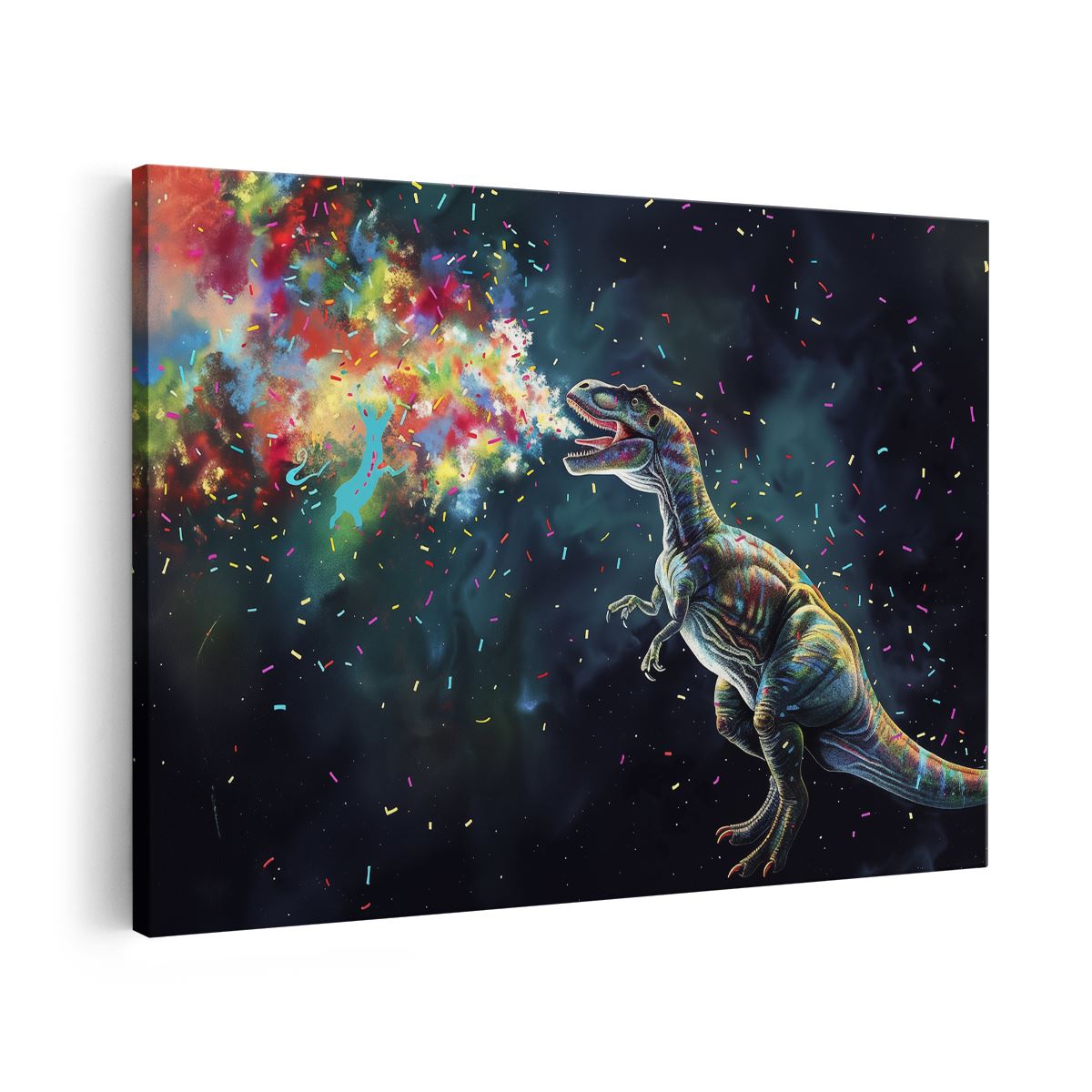 Schilderij T - Rex Blaast Kleurrijke Confetti