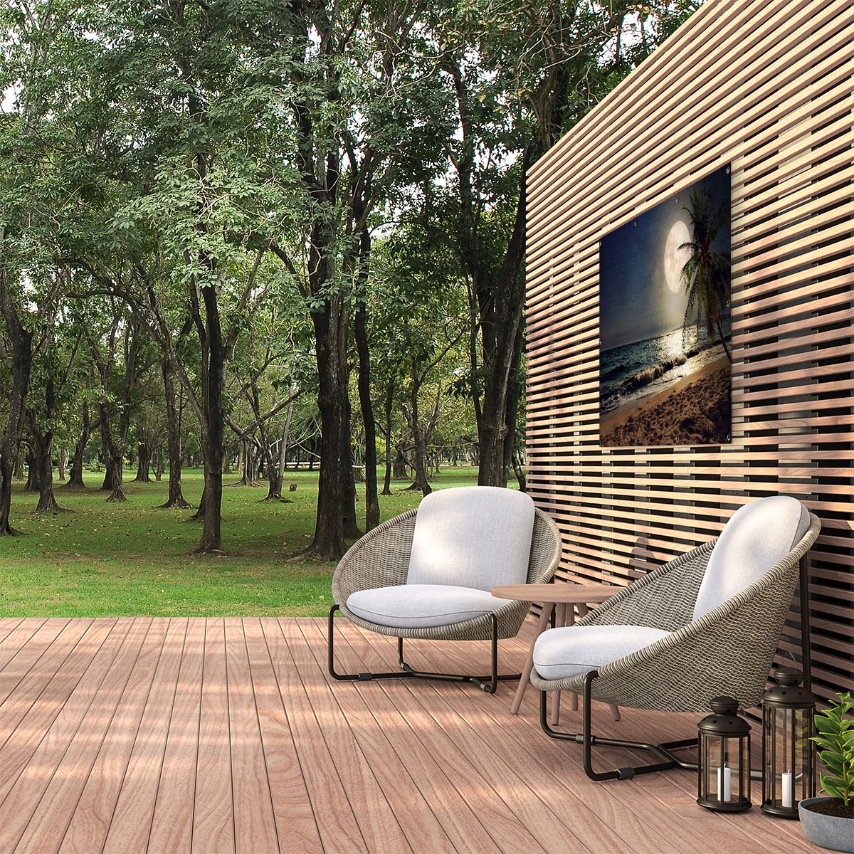 Tuinposter Tropisch Strand In De Nacht Met Volle Maan