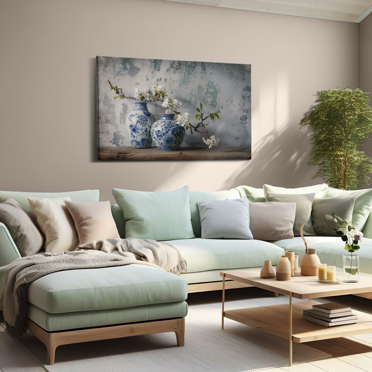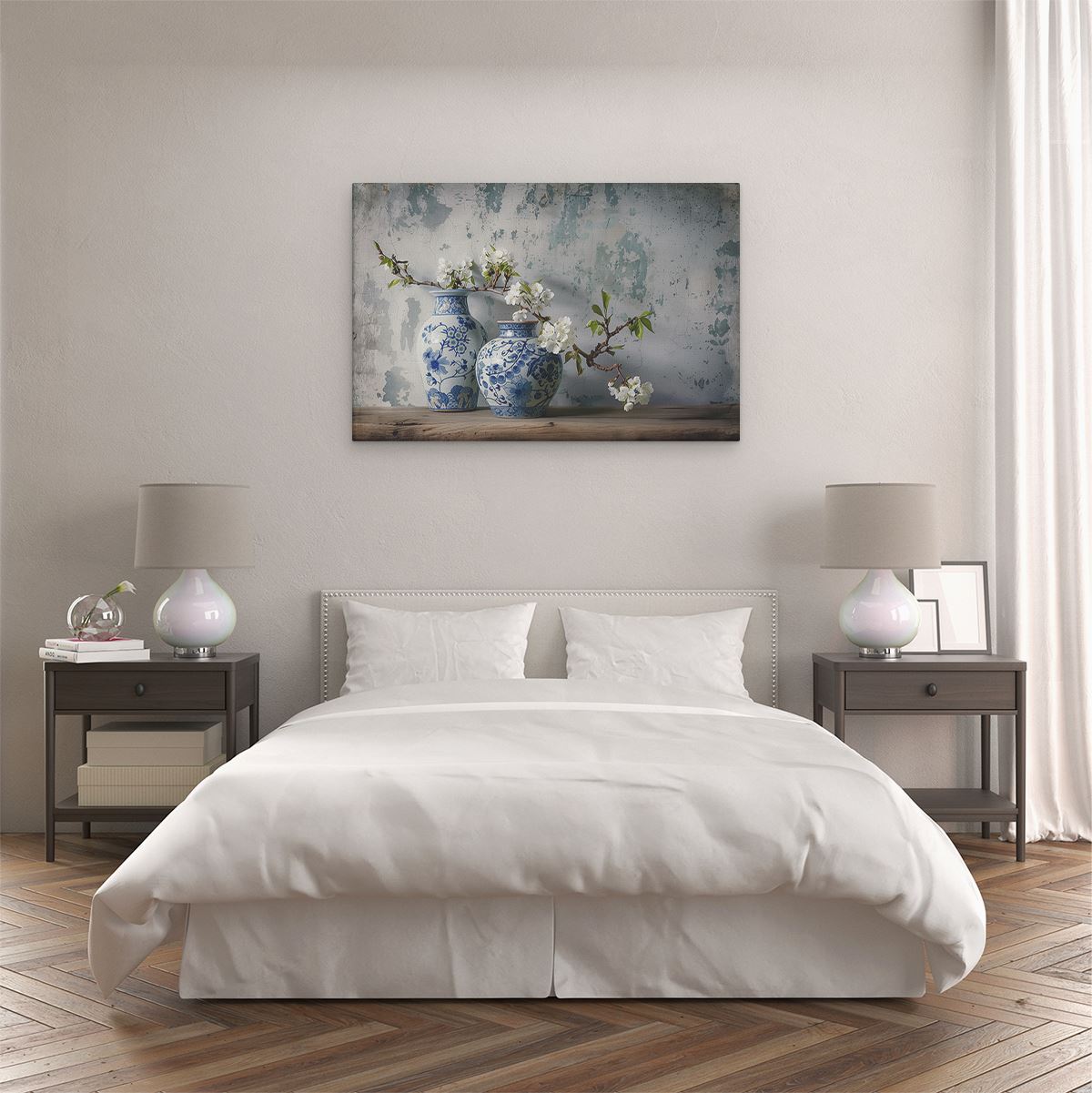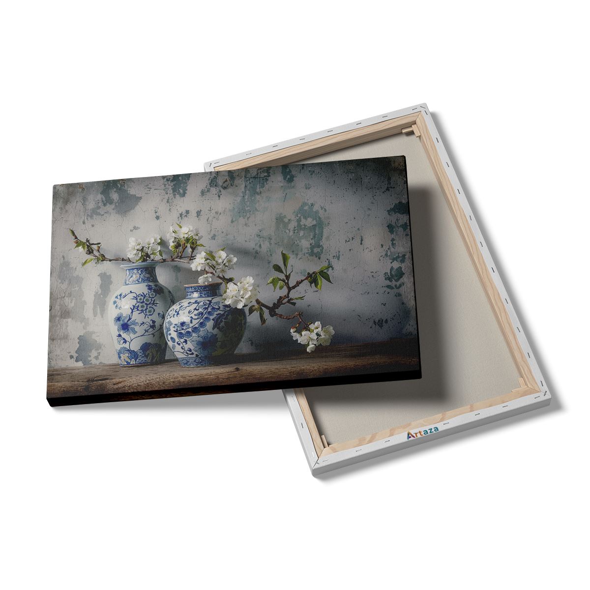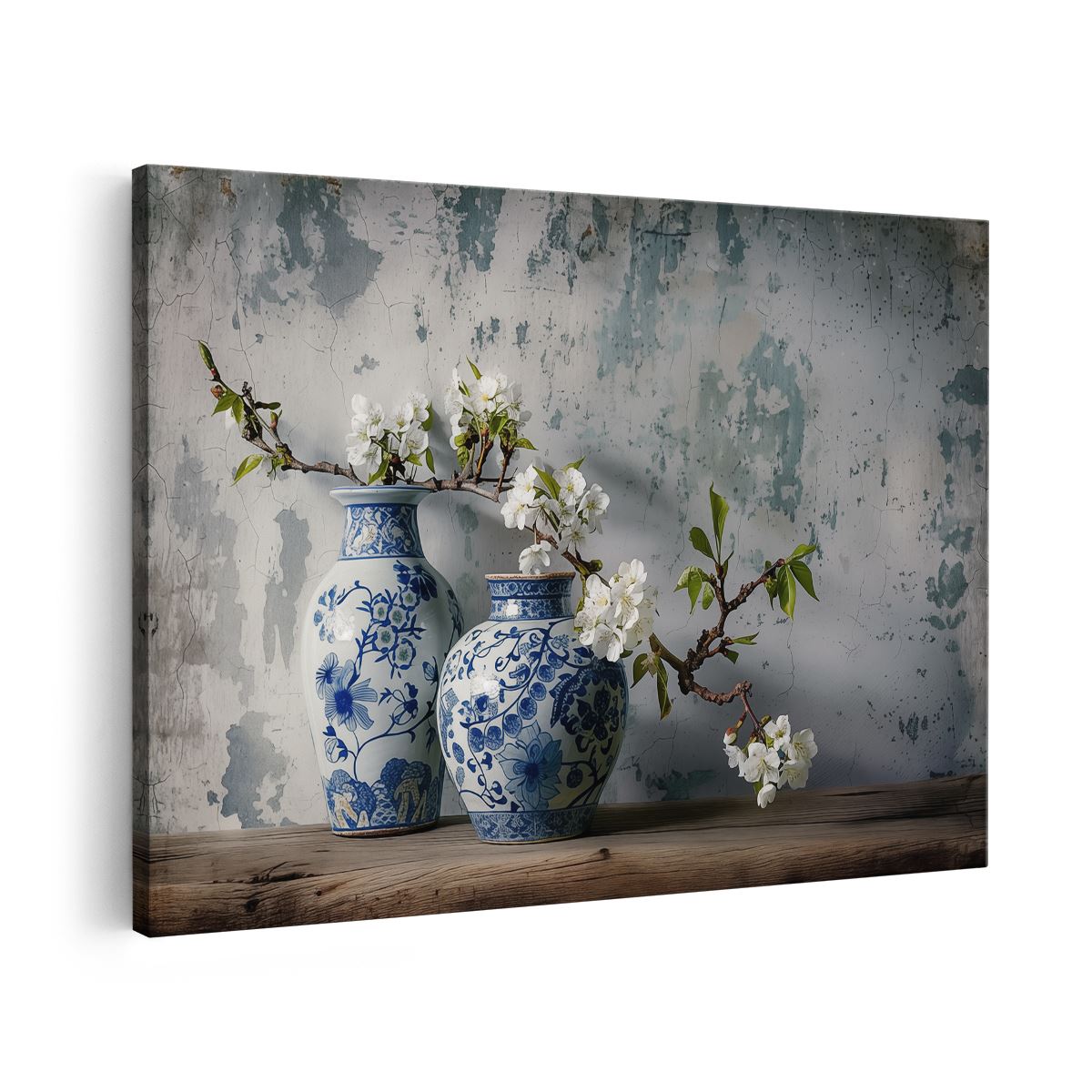 Schilderij Twee Blauwe en Witte Vazen Op een Houten Tafel