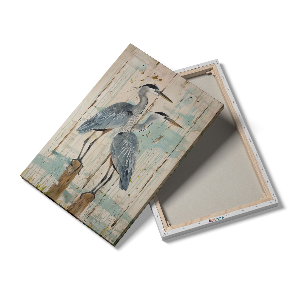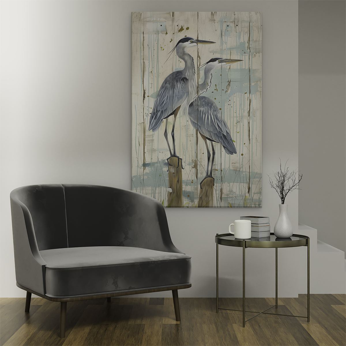 Schilderij Twee Blauwe Reigers op een Houten Paal