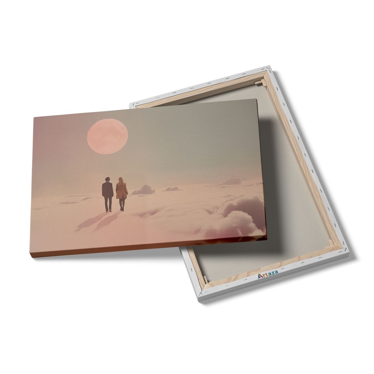 Schilderij Twee Mensen die Bovenop Wolken Staan Met een Volle Maan Achter Hen