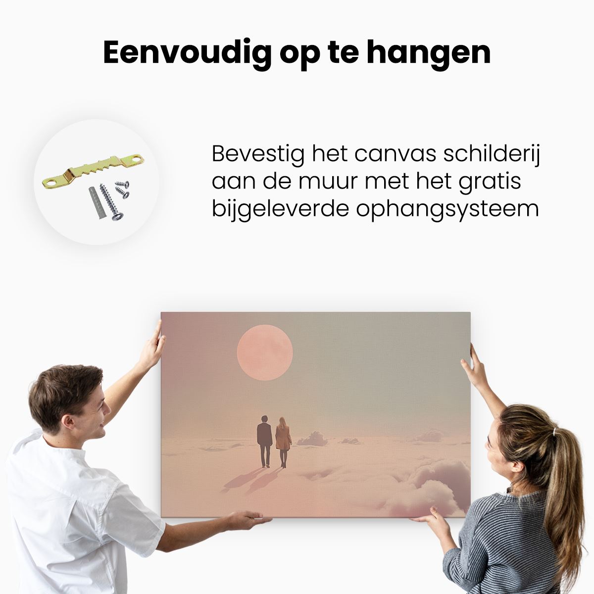 Bij aankoop ontvang je een meegeleverd ophangsysteem, zodat je op een simpele en snelle wijze het schilderij boven de bank of bed kan monteren.