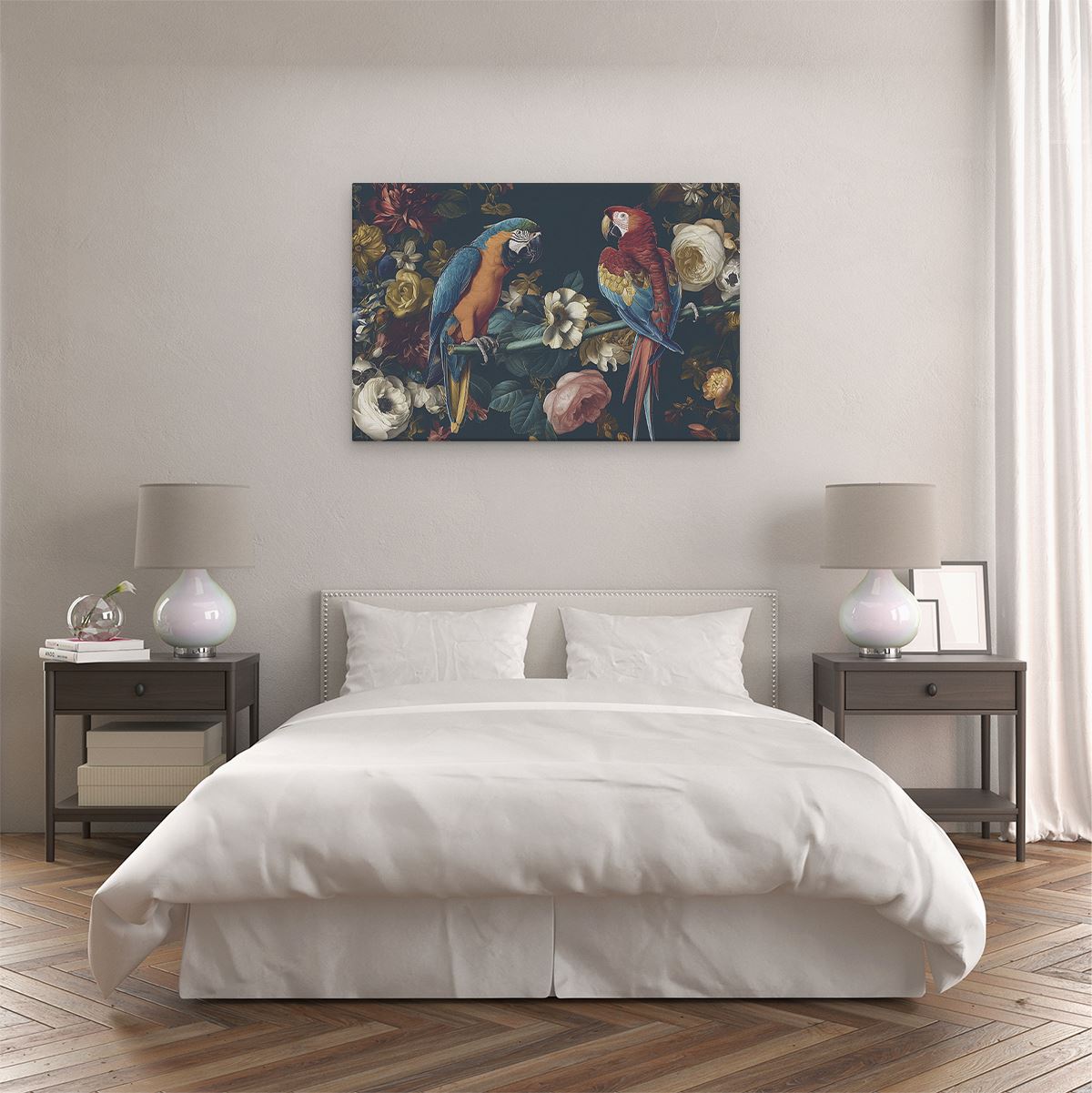 Schilderij Twee Papegaaien op een Tak met Bloemen