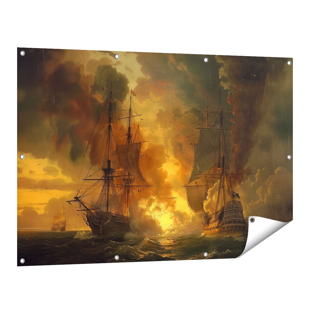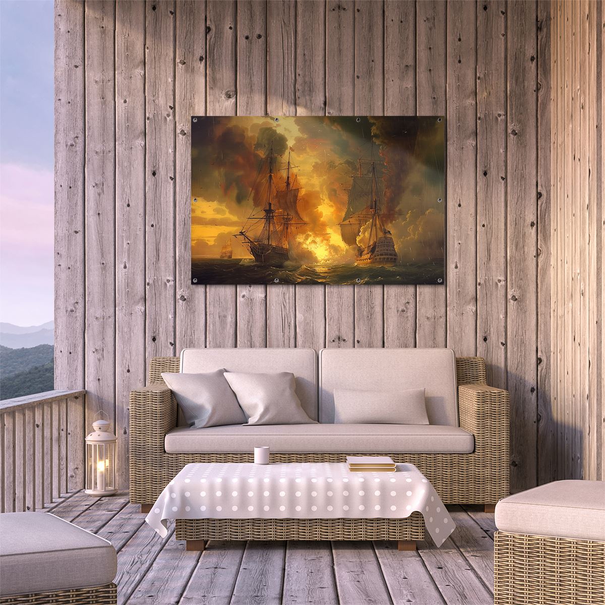 Tuinposter Twee Schepen in Brand in de Oceaan