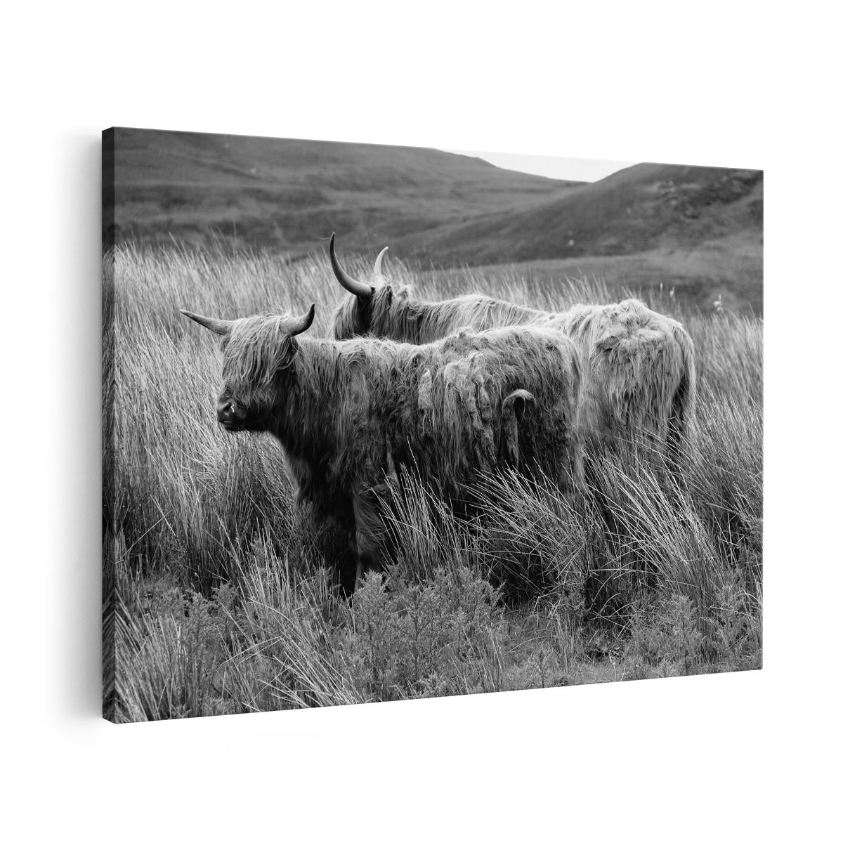 Schilderij Twee Schotse Hooglanders in het Heuvelvelachtige Veld - Zwart Wit