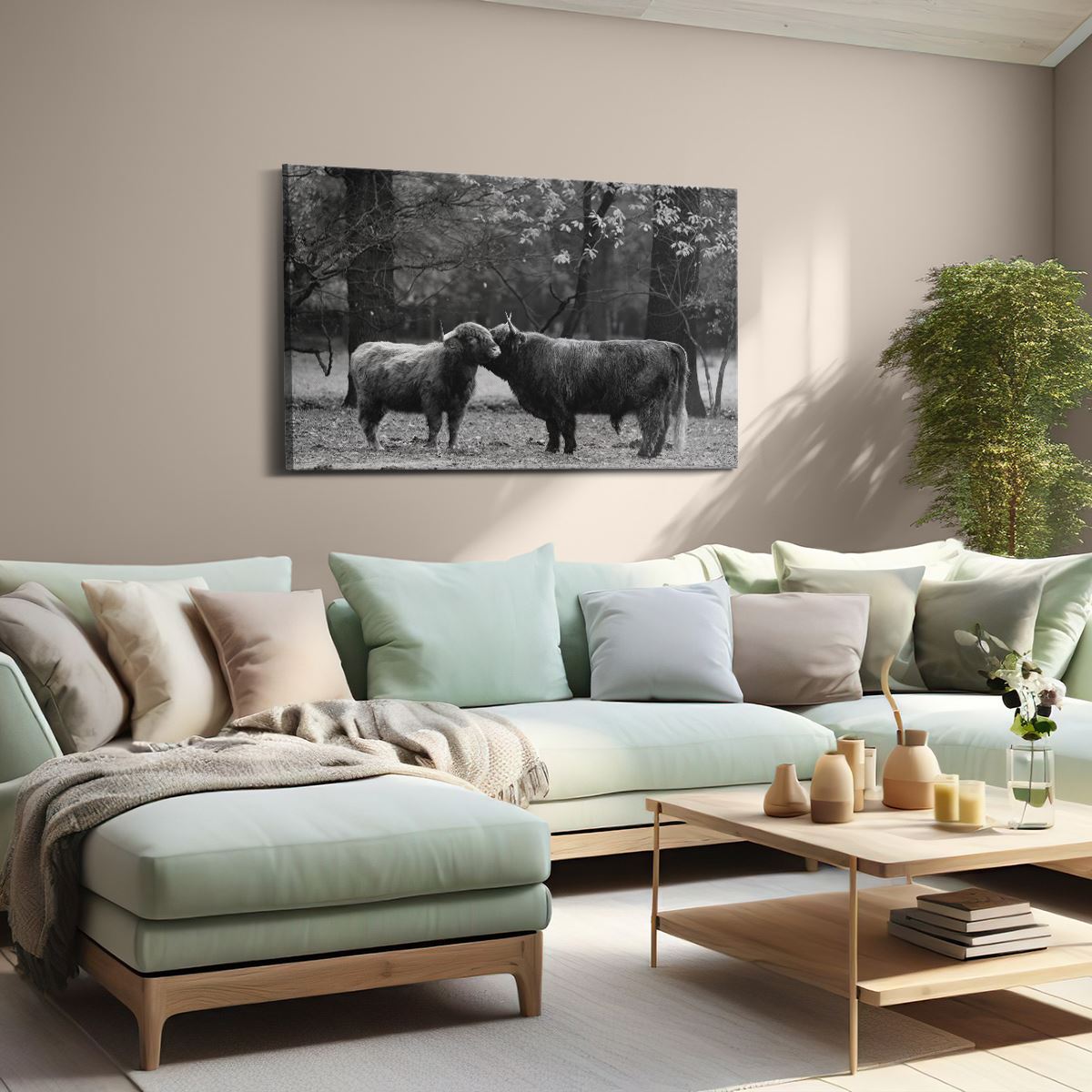 Schilderij Twee Schotse Hooglanders Kussen Elkaar - Liefde - Zwart Wit