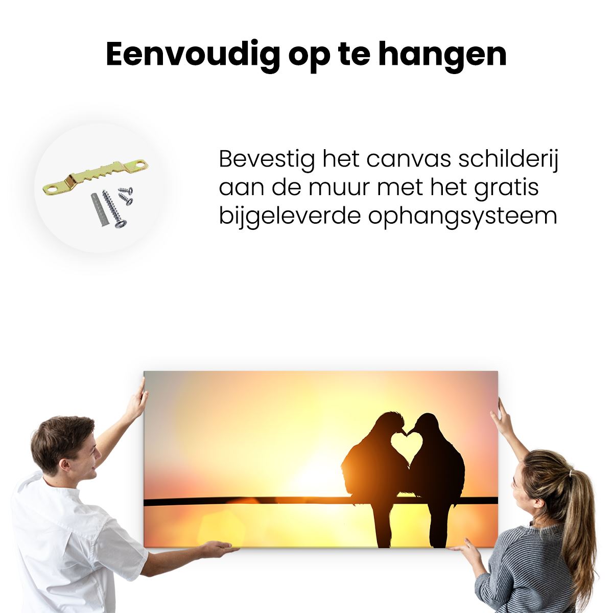 Bij aankoop ontvang je een meegeleverd ophangsysteem, zodat je op een simpele en snelle wijze het schilderij boven de bank of bed kan monteren.