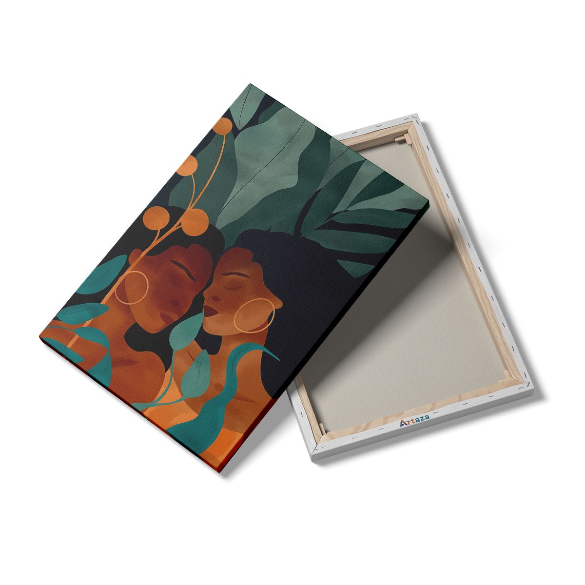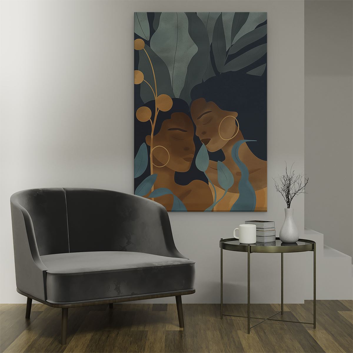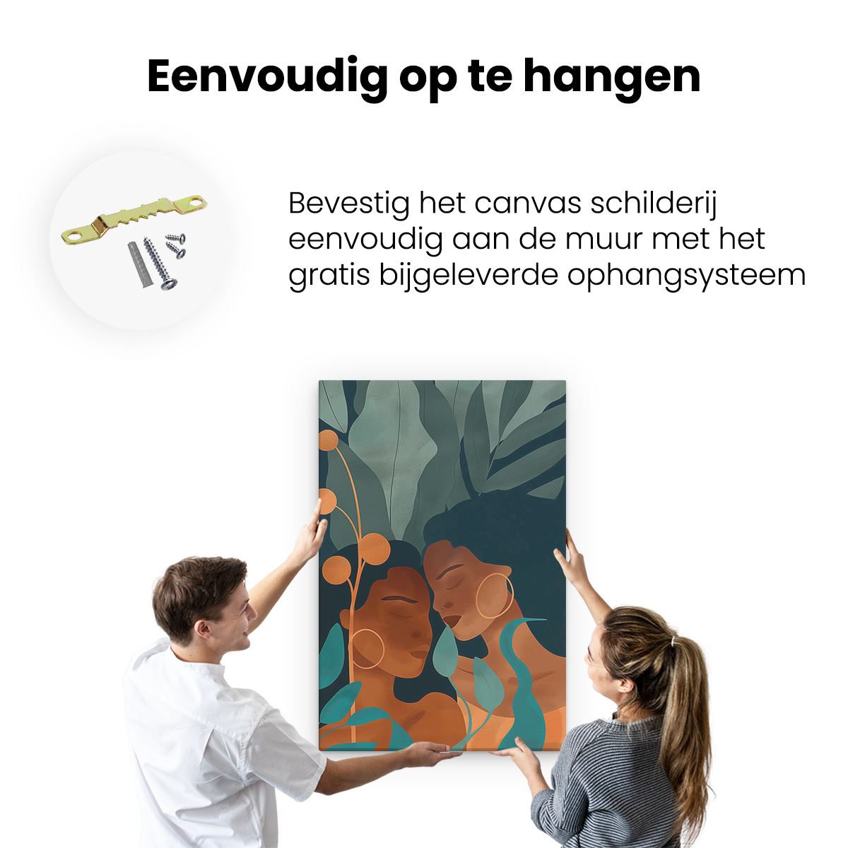 Schilderij Twee Vrouwen die Elkaar Omhelzen in een Tropische Setting